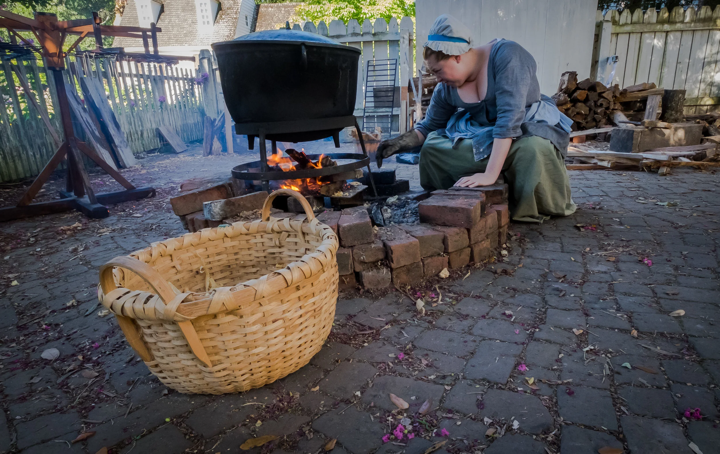 At Colonial Williamsburg the fires are begun early for various crafts. Here wax is being melted for the days candle dipping. What is a brief aside for today's visitors was an ongoing frequent chore for those who lived in that era.