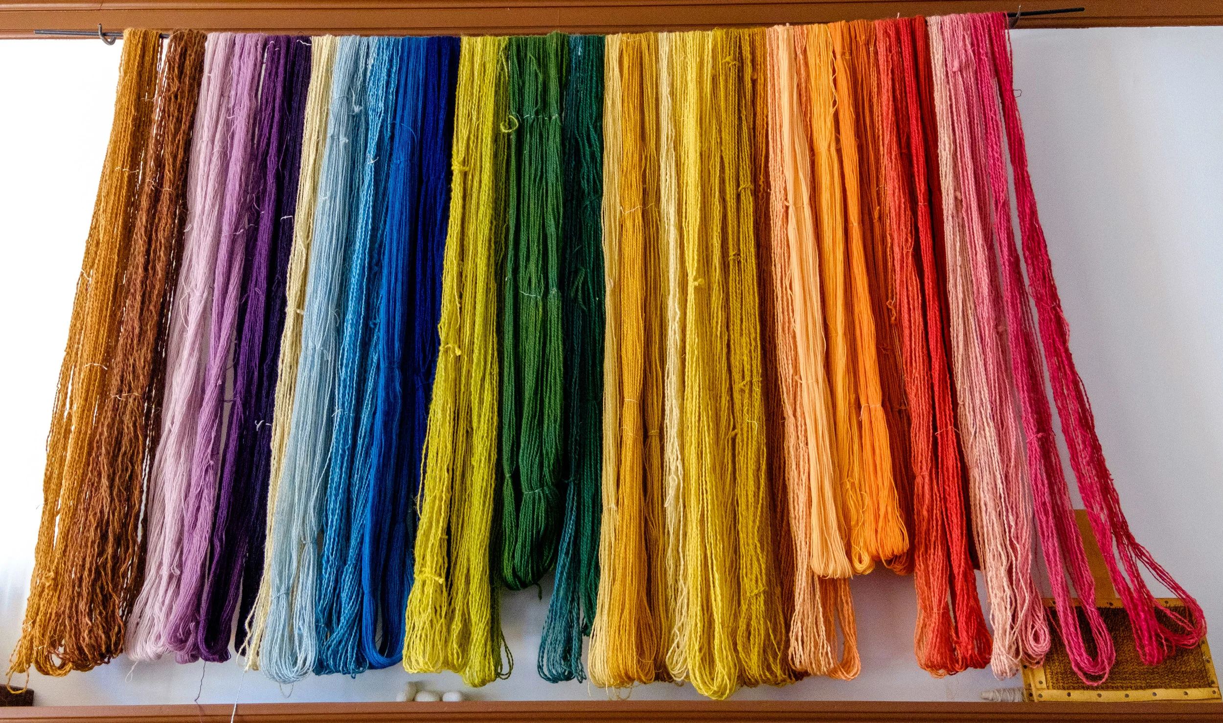 These vibrant yarns are at the weaving house at Colonial Williamsburg. They are produced with natural dyes from roots, fruits, flowers, seeds etc. It took several years for an apprentice to become a qualified dyer and four additional years with a different master to learn how to dye greens. A PhD in green, who knew.