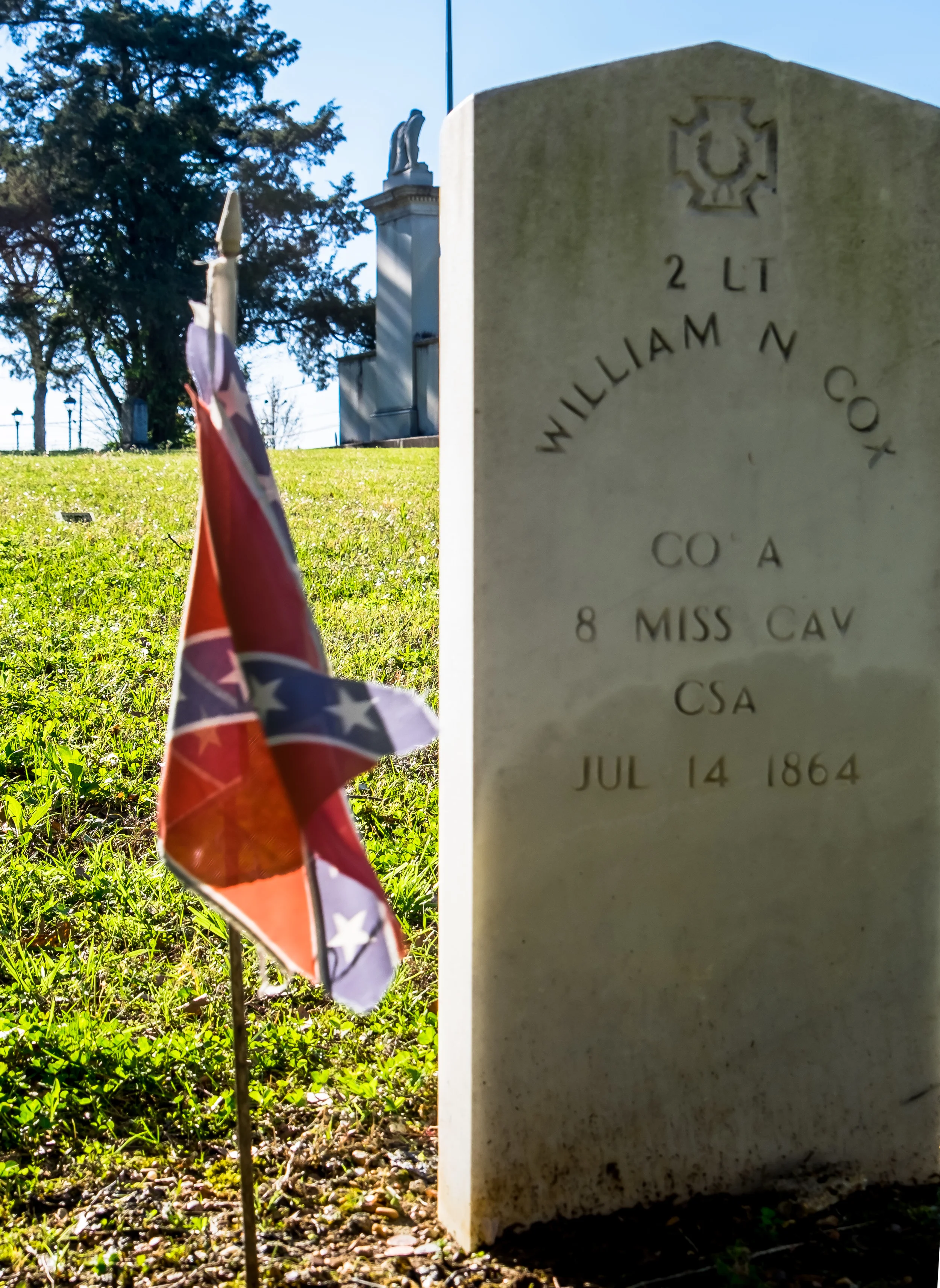 This is one of two graves on the small corner lot size site just off a busy street. It seemed infinitely sad to me. The stone was askew, not the neat rows of a National Cemetery and sort of awkwardly situated a few yards from a private home. The tattered flag may not be replaced as I read the park service was not going to use confederate flags any longer. There were two graves here both confederate soldiers. I wondered why they were buried here when the death toll among the South's soldiers numbered over 200. The battle was fought 152 years ago, today.