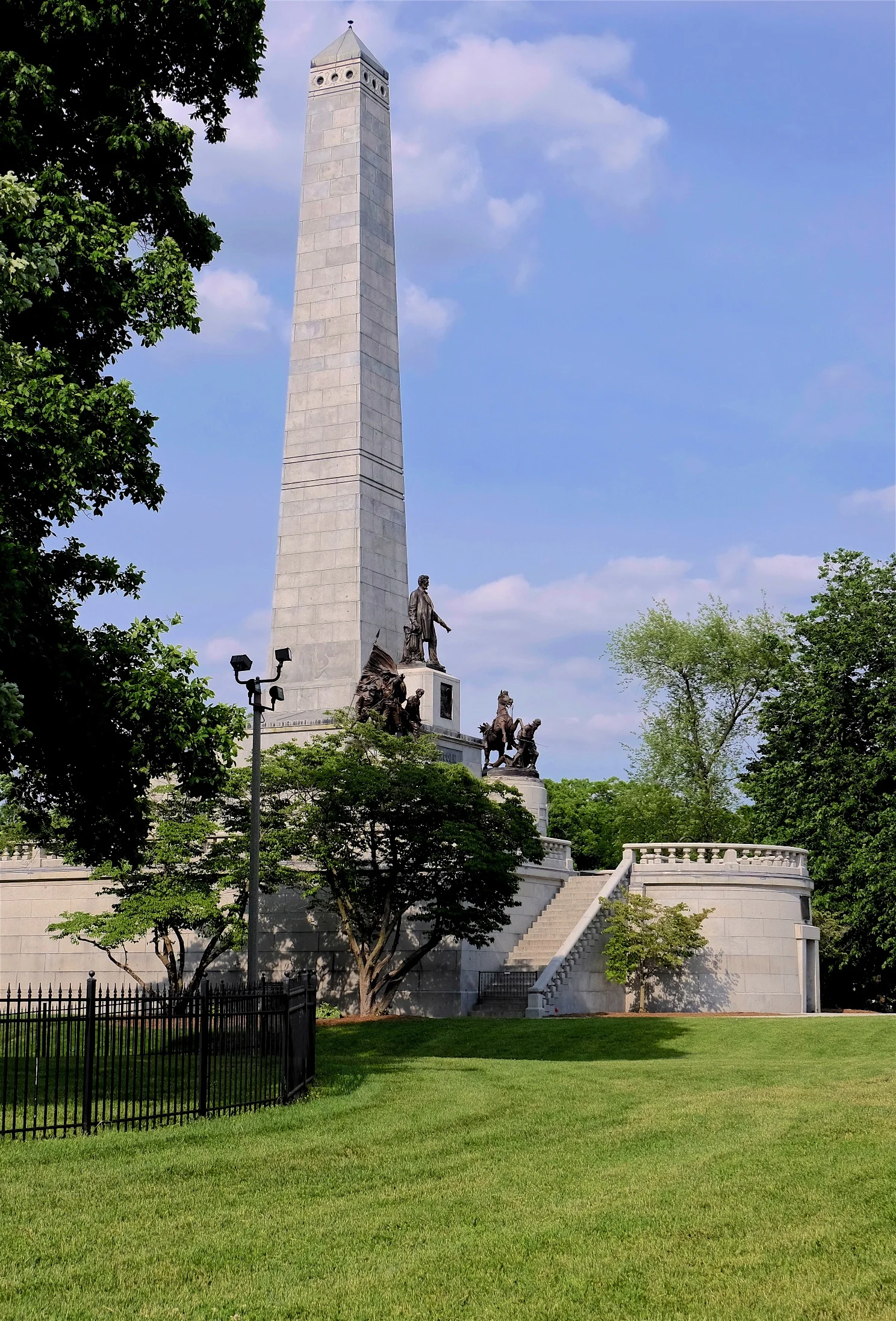 Abraham Lincoln is buried in this monumental crypt at the Oakwood cemetery in Springfield, Illinois. There are several statues around the area, most of them Civil War soldiers or patriotic symbols. The stone inside is simple and set alone in an alcove. You pass many more statues, usually small, in the corridors to and from the tomb itself.
