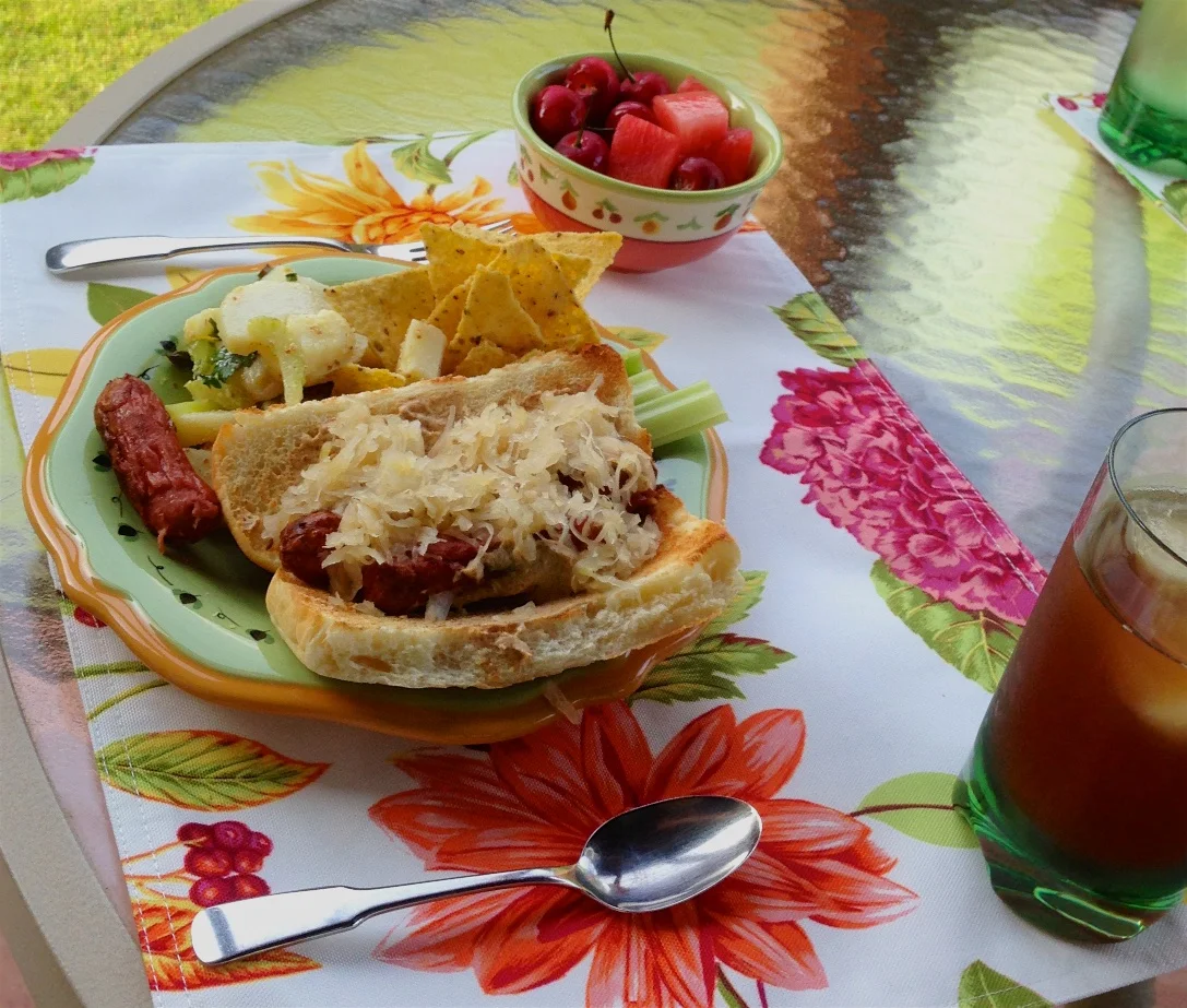 For me, hot dogs with sauerkraut, fresh fruit, mustard potato salad, and homemade ice cream for dessert. Hope your day is great, cause somedays the best meals are simple and at home.