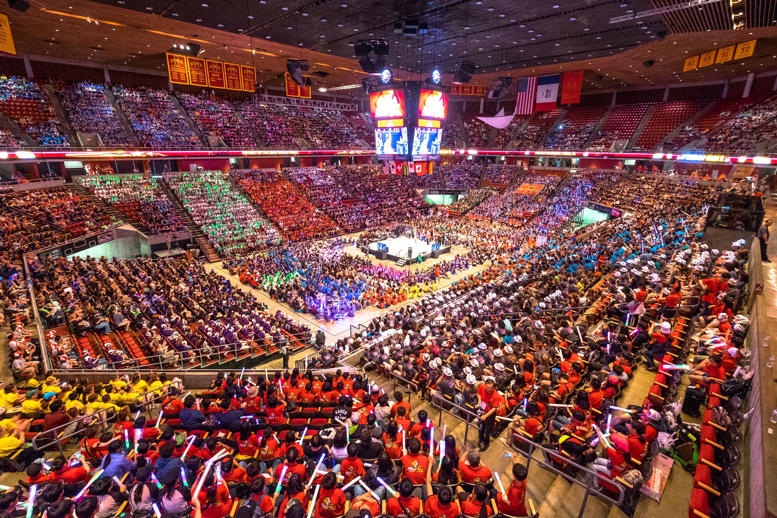 The World finals for 2016 were held in Ames, Iowa at the basketball arena at Iowa State. Our grandson's team was here to complete and they took third place in their division. This is from the opening ceremony. 21,000 kids make a lot of noise! What a treat for us to see it all.