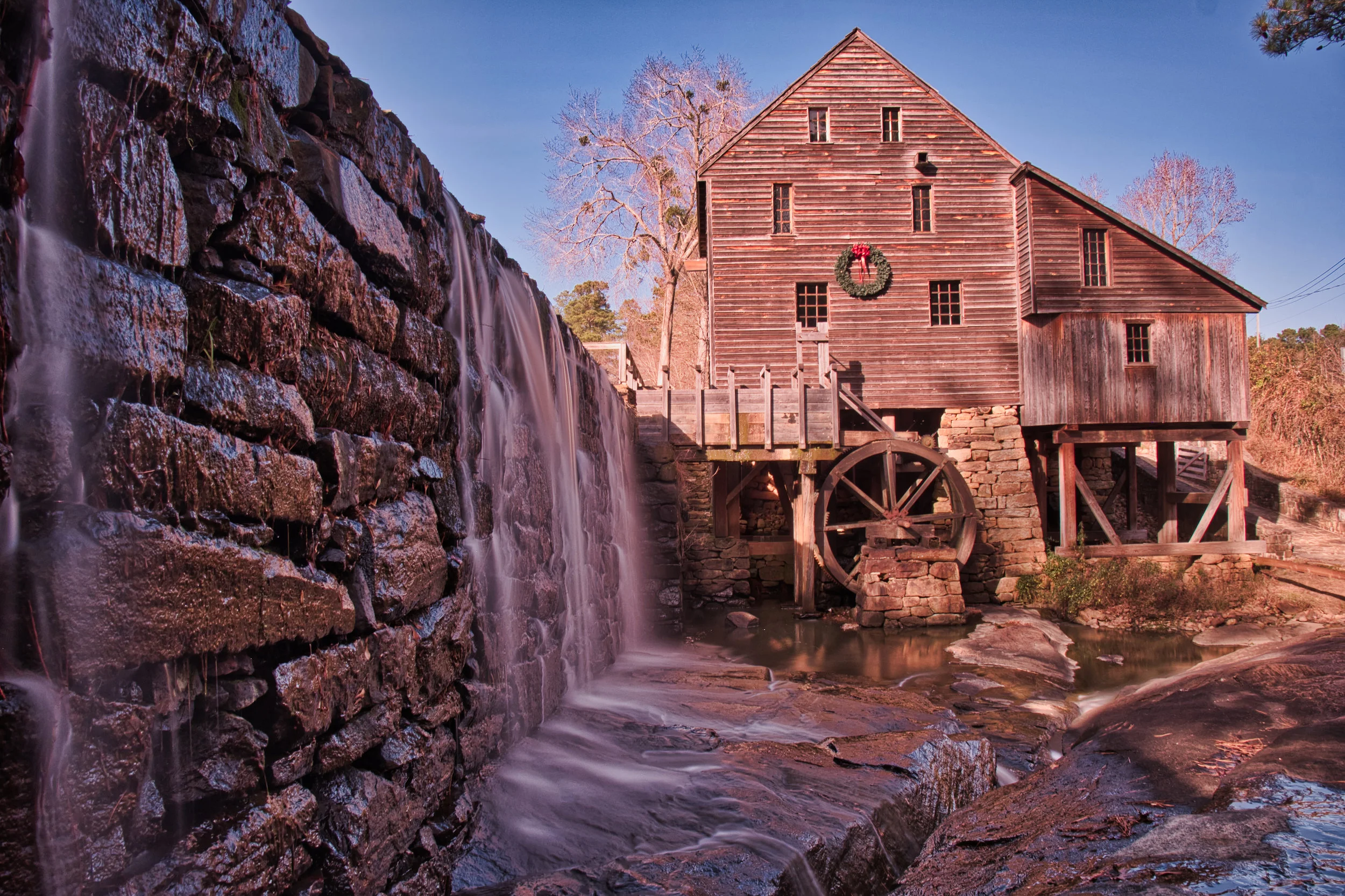 Same mill but below the dam. Yates Mill is a fully restored, circa 1756 gristmill on about a 20 acre pond south of Raleigh. It is one of the oldest structures in the area. It operated as a grist mill (and often a saw mill) until 1953 when it closed. Now it is a regional park and much of the original land an experimental farm for NC State.