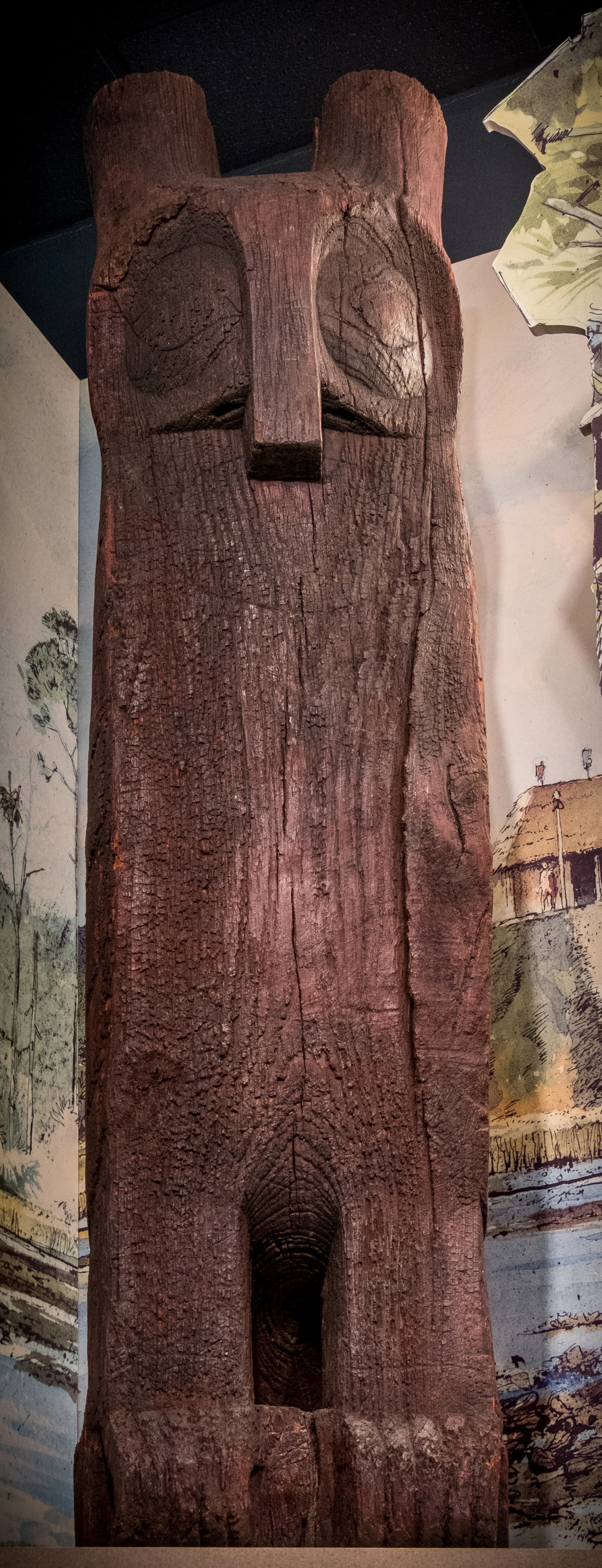 This large (about a 6 feet tall figure with a large base, not shown) carved wooden owl was found along the central Florida coast in the mire of the marshland. It was preserved because no oxygen would attack it in the thick mud. Carved by the Timucuan indians it was likely some sort of idol because the eyes have a human iris set into them and the feet are five toes instead of three talons. One of the oldest pre-Columbian artifacts yet discovered. The main thing about the owl is that it is striking. Perhaps the neatest part of our visit to the Timucuan Ecological and Historic Preserve. I cropped the photo quite a lot because the background was so busy and distracting. The owl deserves a better display.