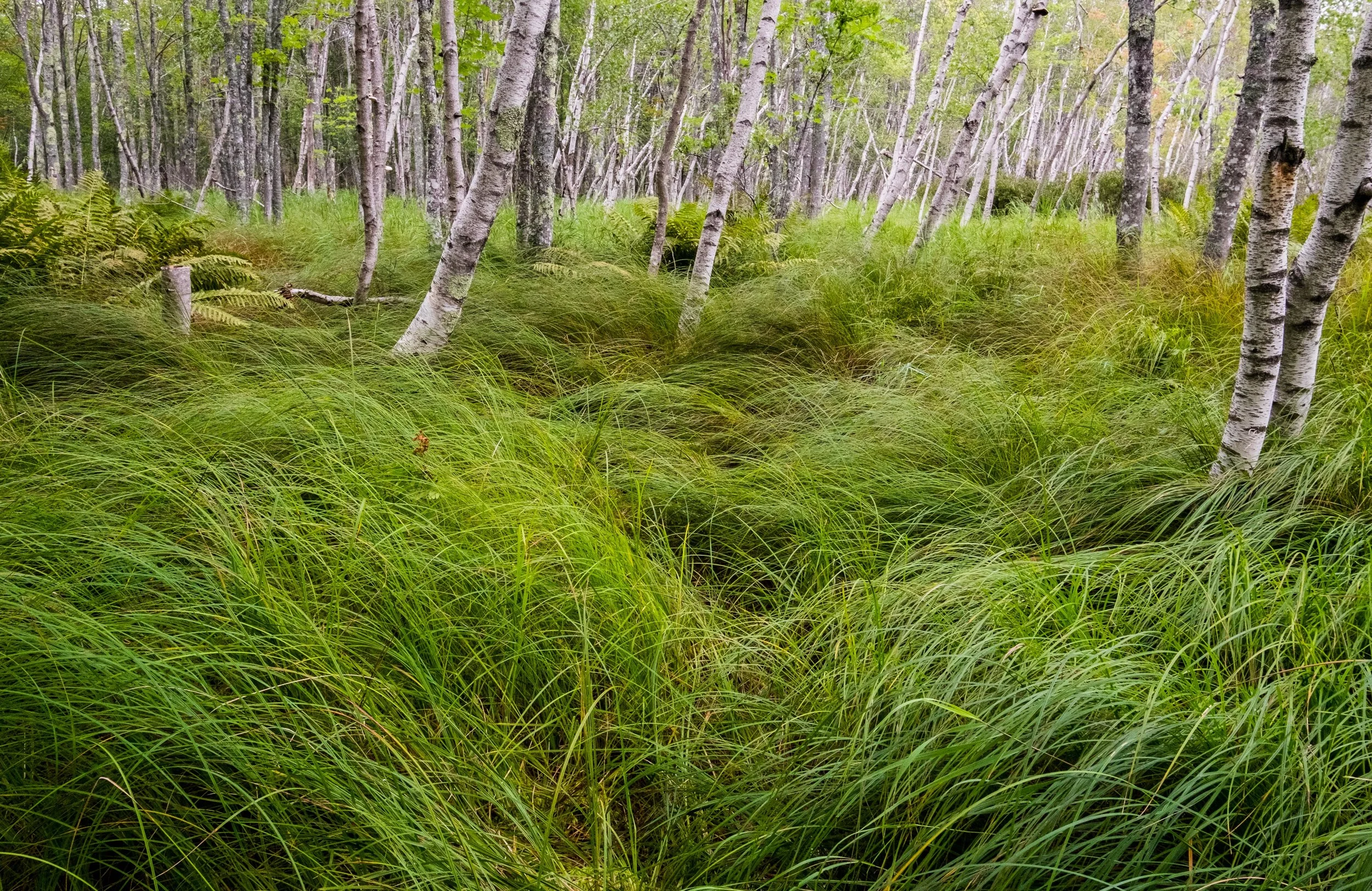 Near the Acadian gardens there is a long very straight boardwalk across marshy land filled with grasses and birch trees. In Acadia National Park.
