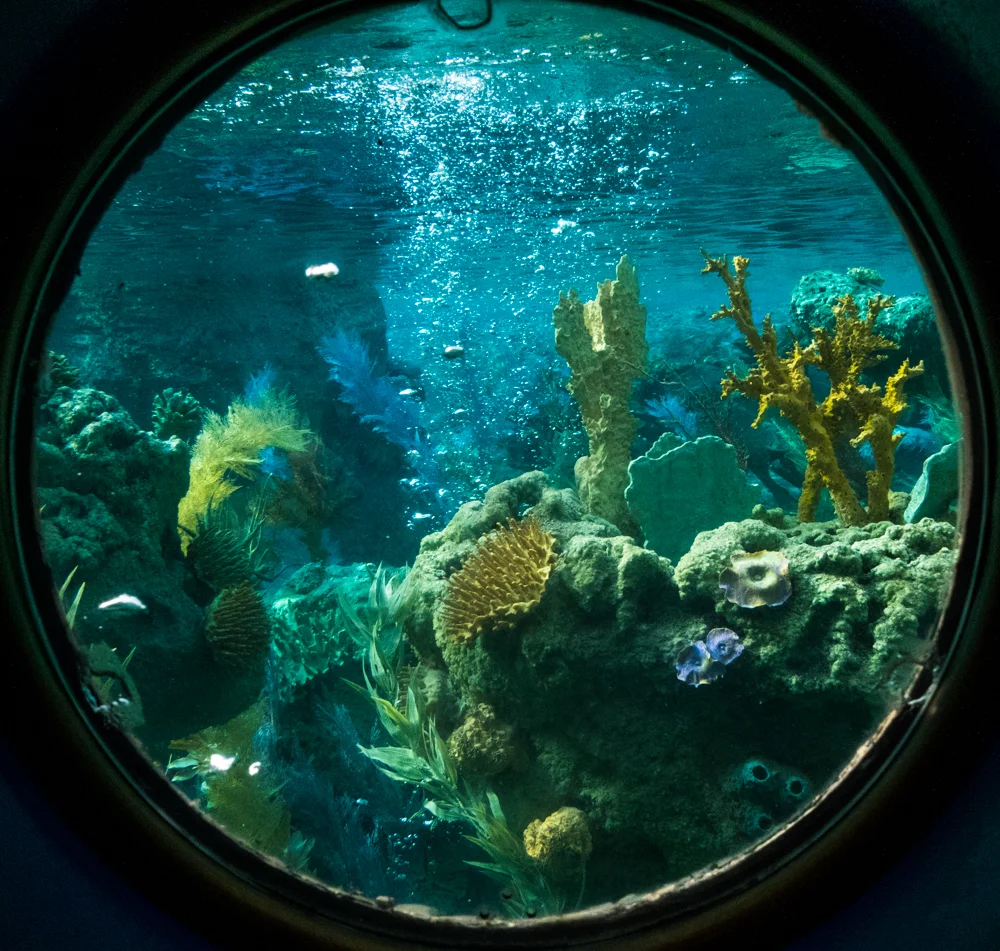 The submarine ride is still at Disneyland. A "slow-loader" it was taken out at Disneyworld. It is quite well done. Through a porthole window.