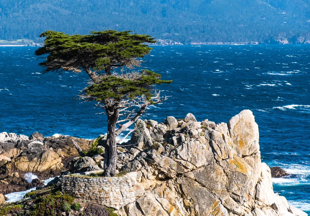 This is the protected signature of the Pebble Beach conglomerate, so you can't sell or use this image for commercial purposes. (There goes my plan for world domination of the single cypress tree photo industry.) Both it and the drive were a bit of a disappointment. The drive was over stunning scenery but it is crowded with homes and you only get brief glimpses of the shore, the roads are public but they are gated so they charge you to take the famed 17 mile drive. The first portion along the shore leading to the pay road is much nicer. The three or four stops are like the "lone" tree, hyped past the reality. We drove south of there on US 1 toward Big Sur and the views were incomparable. So, if I were to eliminate one thing from the trip is would be this 17 mile drive off Monterey.