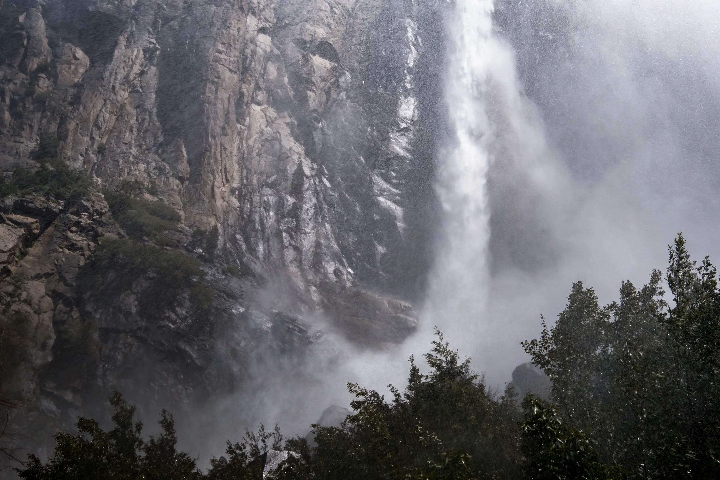 Bridal Veil Falls in Yosemite is know for its mist and spray. Last spring it was so full that you were getting soaked at a few hundred feet from the bottom. It was glorious, roaring and very wet.