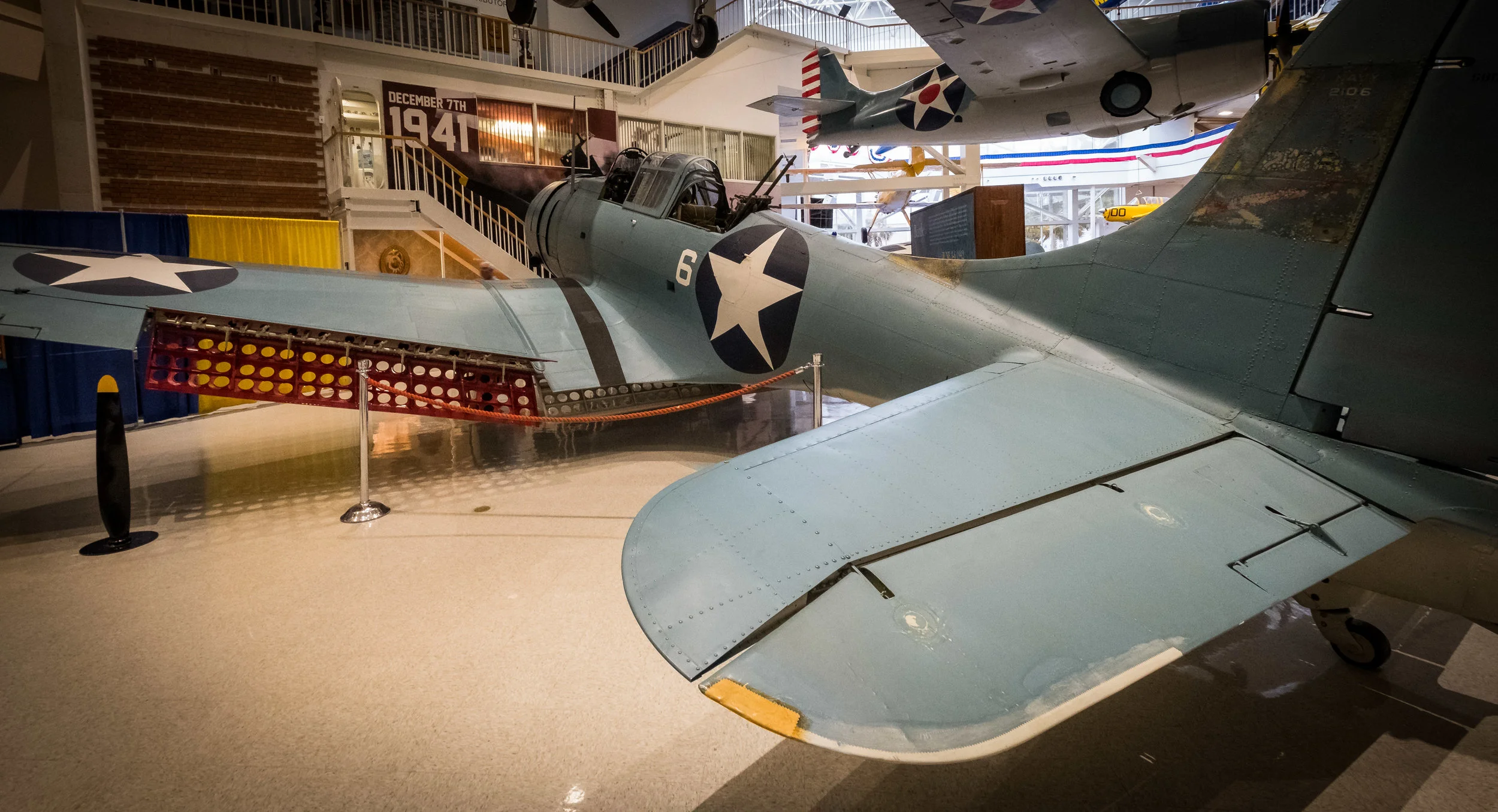 Awe is a serious word and I would not use it lightly. It most often is attributed to an aspect of God or His creation. But not exclusively. Standing near, touching and viewing this aircraft, if you are the least bit interested in US history, might spark the same response from you. It is a SBD Dauntless, version 2, built in 1941. This actual airplane was at Pearl Harbor on 12/7 but was not damaged. It took part to three other major battles including one of the many Dauntless's that sunk four aircraft carriers of the Japanese navy that changed the course of the war at the Battle of Midway. It returned from that battle with 259 bullet holes. Early in the war the plane was deemed not worthy of more combat so it was ferried to Lake Michigan where it was used to teach new Navy airmen how to land on a carrier. The Navy had converted two side wheel excursion boats to makeshift landing decks in the lake to keep them safe from enemy subs. One pilot missed the deck and the plane was lost. It was recovered a few years ago in great condition and restored for display here at the National Naval Aviation Museum in Pensacola. It is the only Navy plane of its type to see combat in WWII still in existence. See more here: http://www.navalaviationmuseum.org/attractions/aircraft-exhibits/item/?item=sbd-2_dauntless