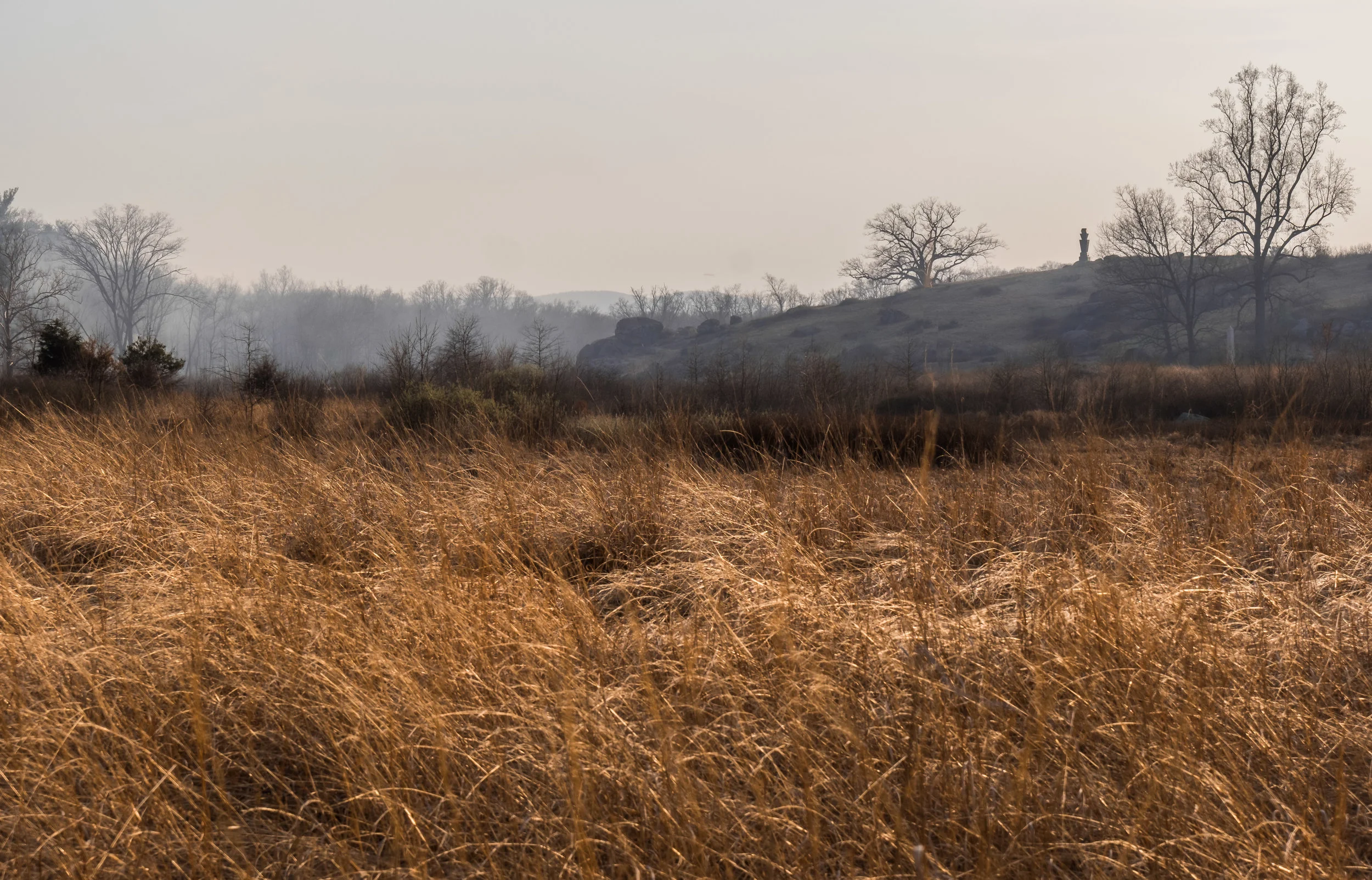 This shot at Gettysburg has Devil's Den in the center background with Little Round Top to the left. What is striking to me about the photo and a good follow-up to Memorial Day, is that the Park Service had just completed a scheduled burn of the underbrush so you can see lots of low hanging smoke and the sky is grey with it as well. When you read accounts of these battles the smoke, lack of vision and eye-stinging air are always mentioned. Welcome to the end of day July 2 1863.