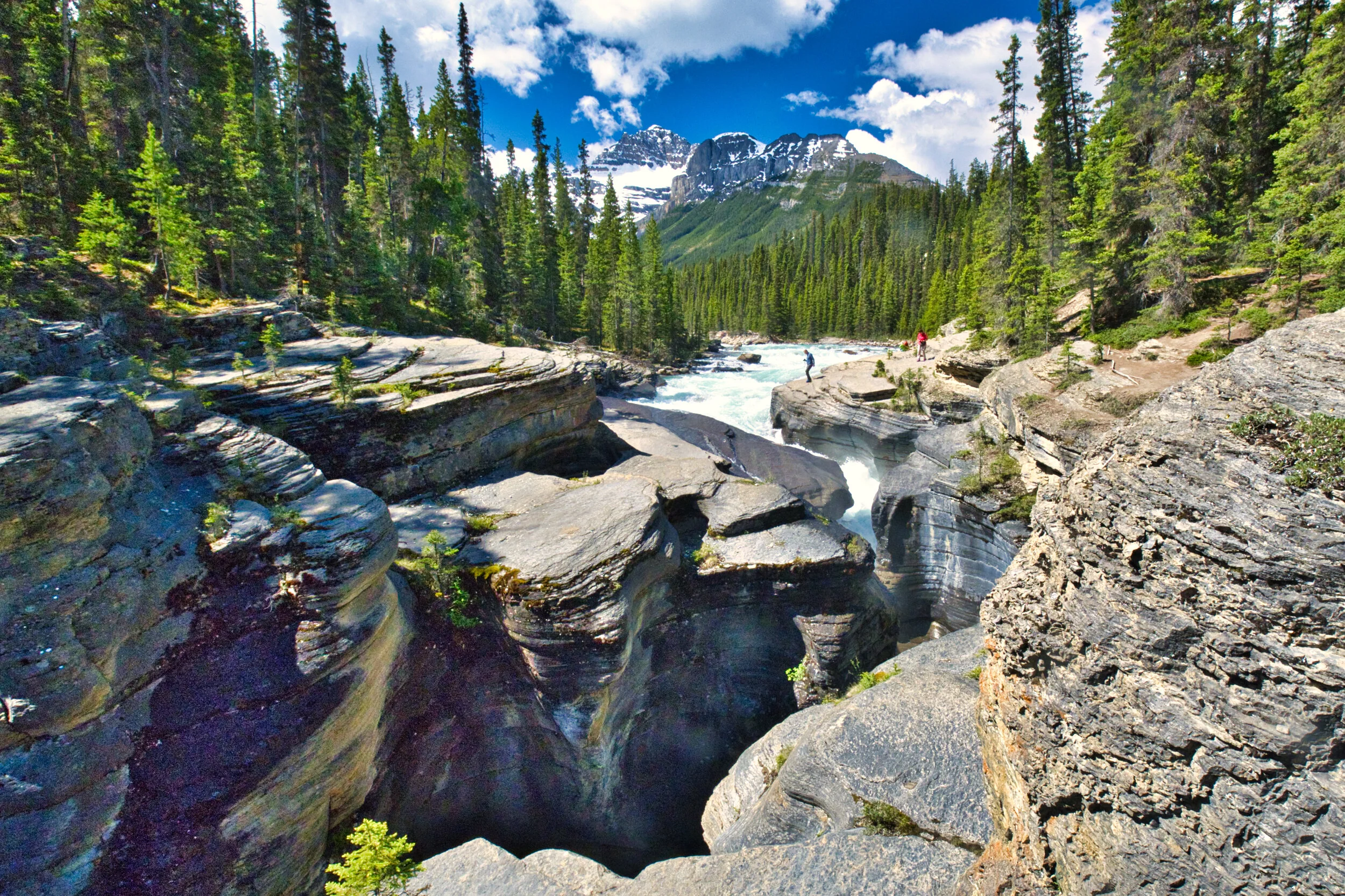 Athabasca Fallsl in Jasper National Park on the upper Athabasca River just west of the Icefields Parkway is a really loud, fast waterfall that has cut a narrow canyon that increases the noise and the fury of the water. Very cool place.
