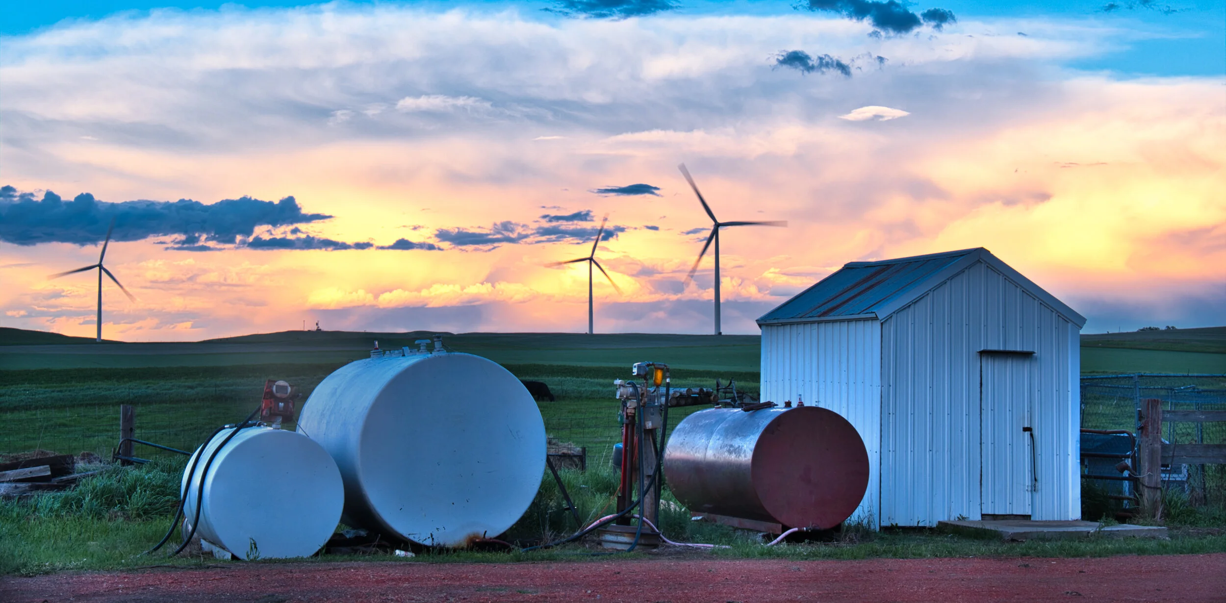 Sunset on the Reindel Farm in North Dakota. The wind turbines overshadow the fuel storage tanks.