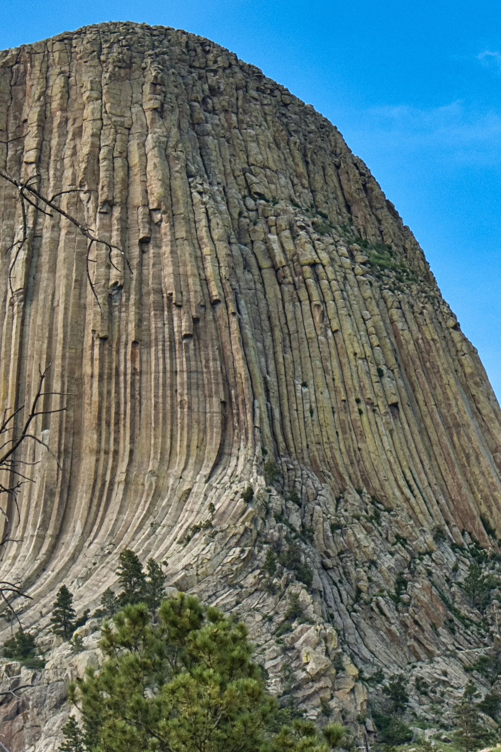 Devils Tower in Wyoming is not a solid rock but is made up of scores of tubes, slightly hexagonal or pentagon with a few other shapes. We were told by the ranger that the tubes are not even secured to each other. Occasionally one falls, occasionally like several hundred years ago for the last one to fall, and they can leave the upper portion of the tube. From this angle those tubes are emphasized.