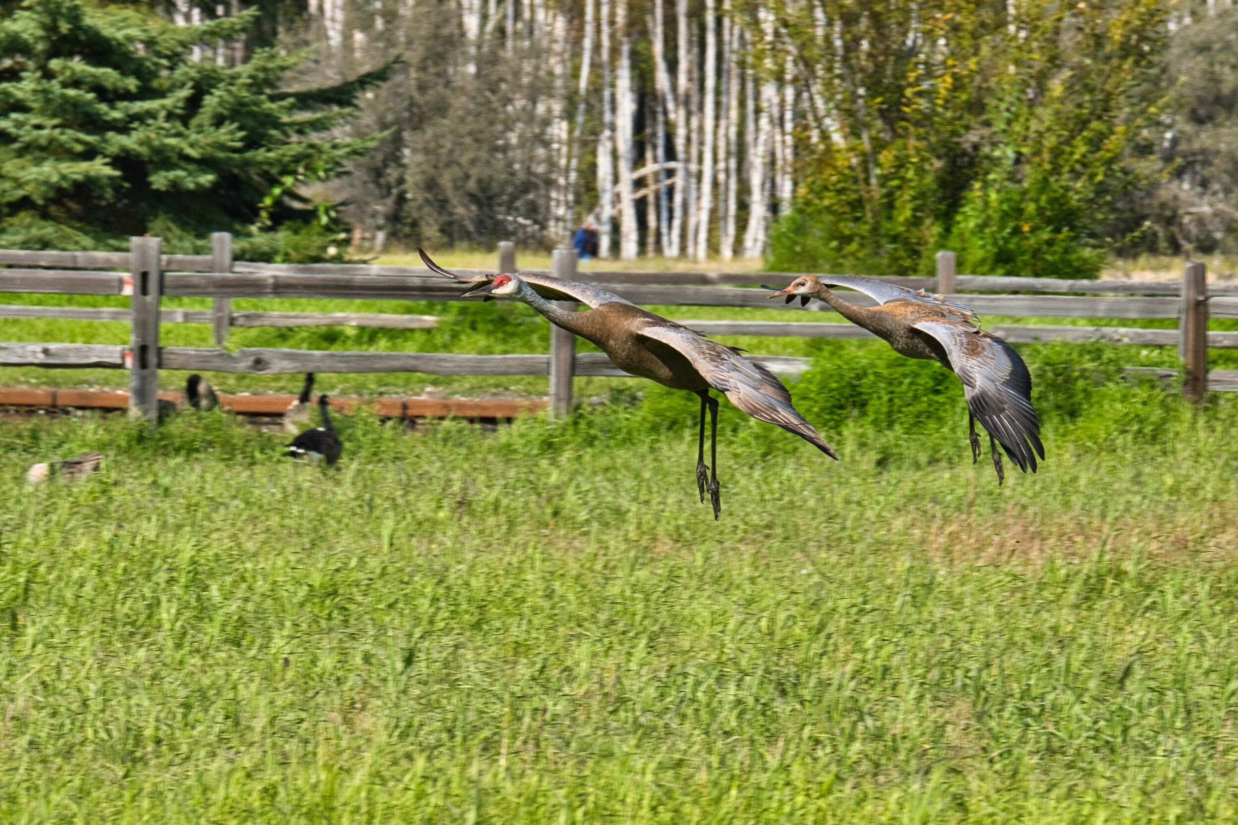 Two Sandhill Cranes flair for a landing in a field near Fairbanks, AK. They are just about to leave for warmer climates so loading up on the calories.