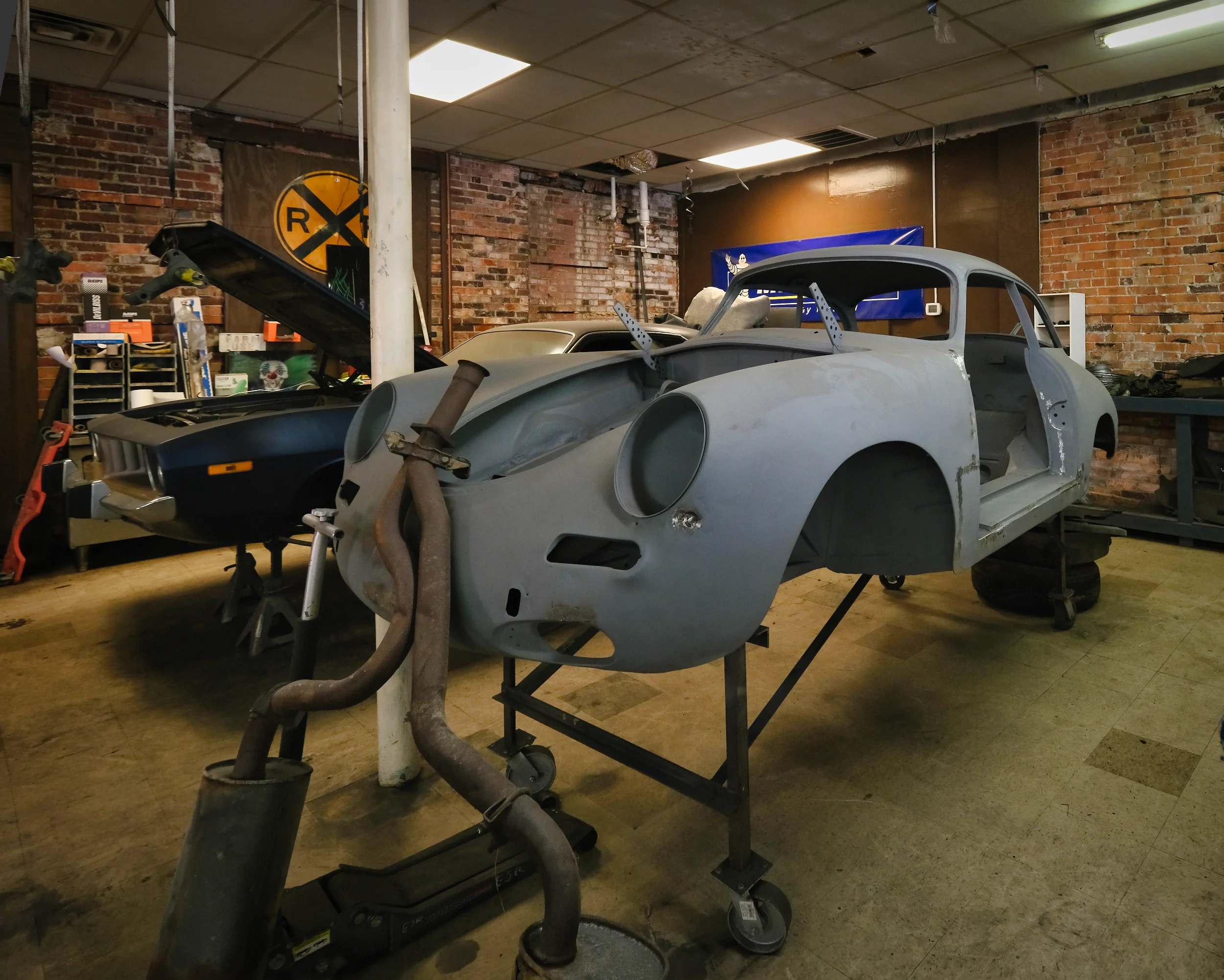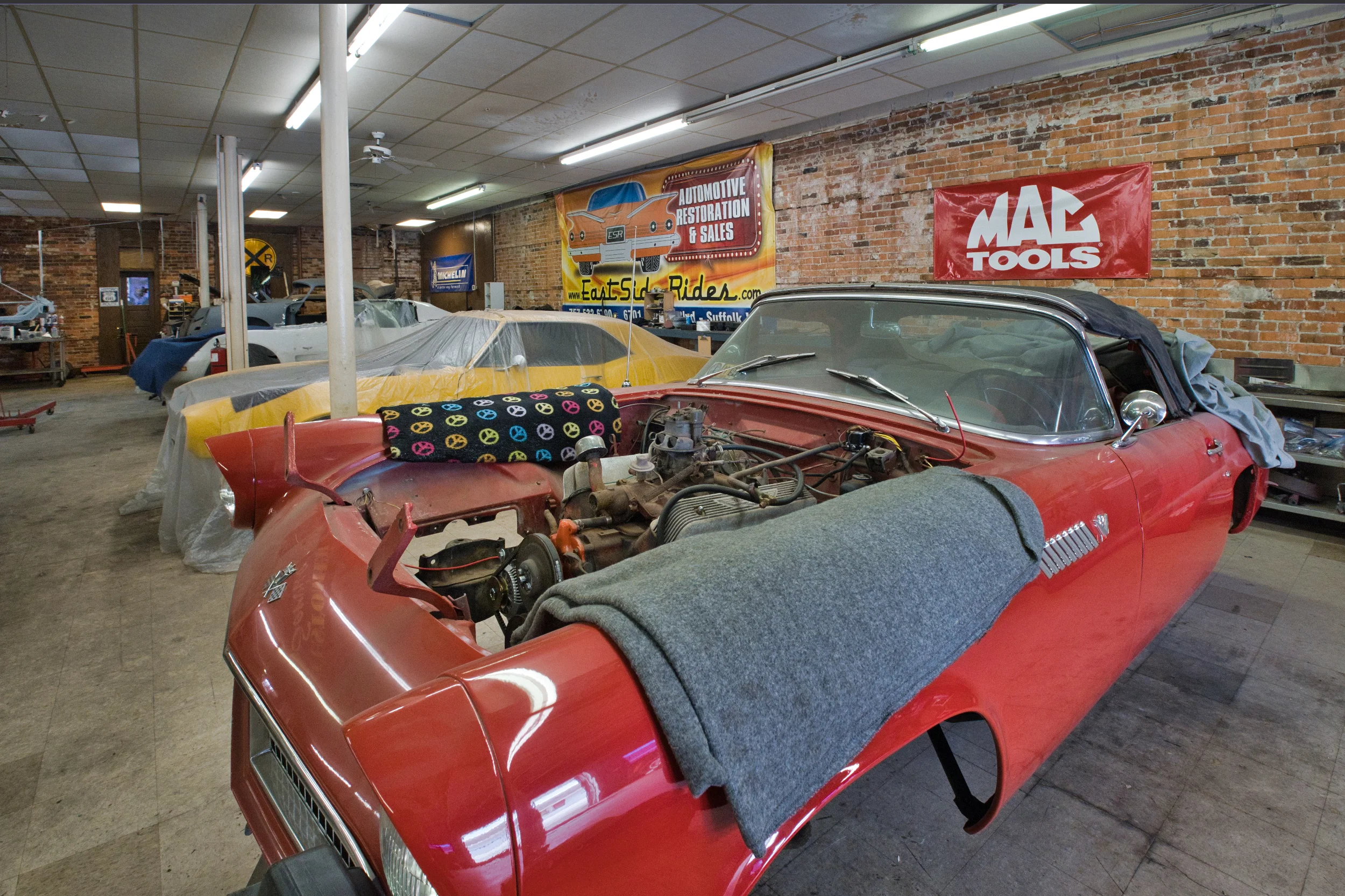 In the small town of Holland, Virginia there is a nondescript collection of store front buildings and an old garage on the main street with a small sign East Side Rides. I went in from the sidewalk through a large open door into a large brick room filled with automobiles from a 1920’s era Packard to 60’s muscle cars in various stages of restoration. There was one worker and I asked if I could take some photos and his answer was sure. He also told me these are not spec cars but customer’s cars and they are books for months and months. Here are a three shots where the light was very dim and hard to see.