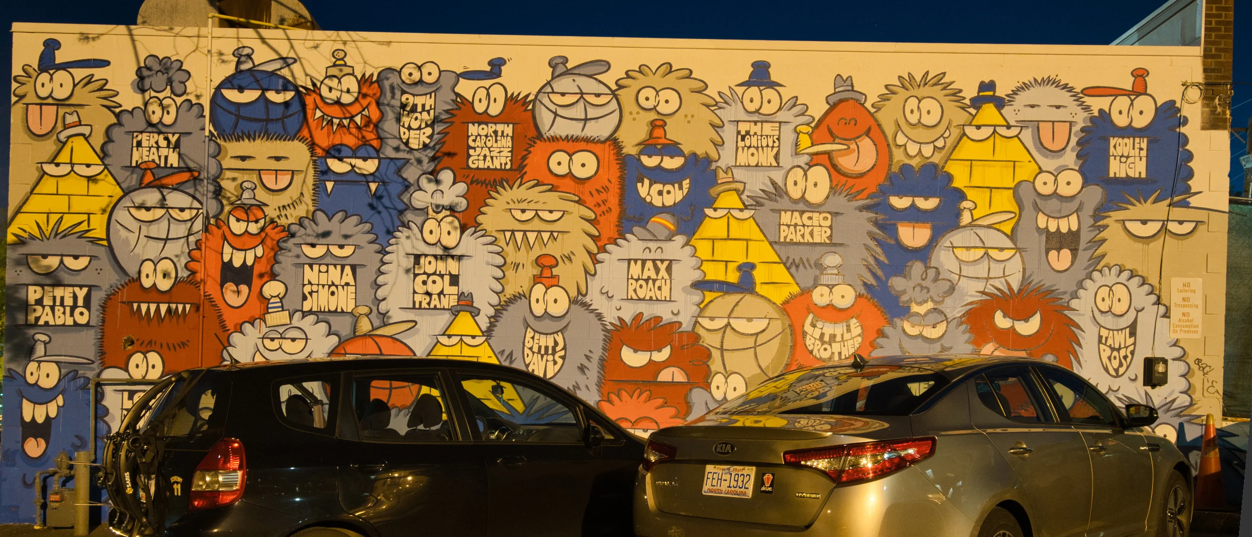 Loved this mural on a restaurant but the options to shoot it were very limited and then there were the cars. I will go back on morning - early - and have space to shoot and no cars. Really neat representing, as stated in a monster at the top left of center, the jazz greats of NC.