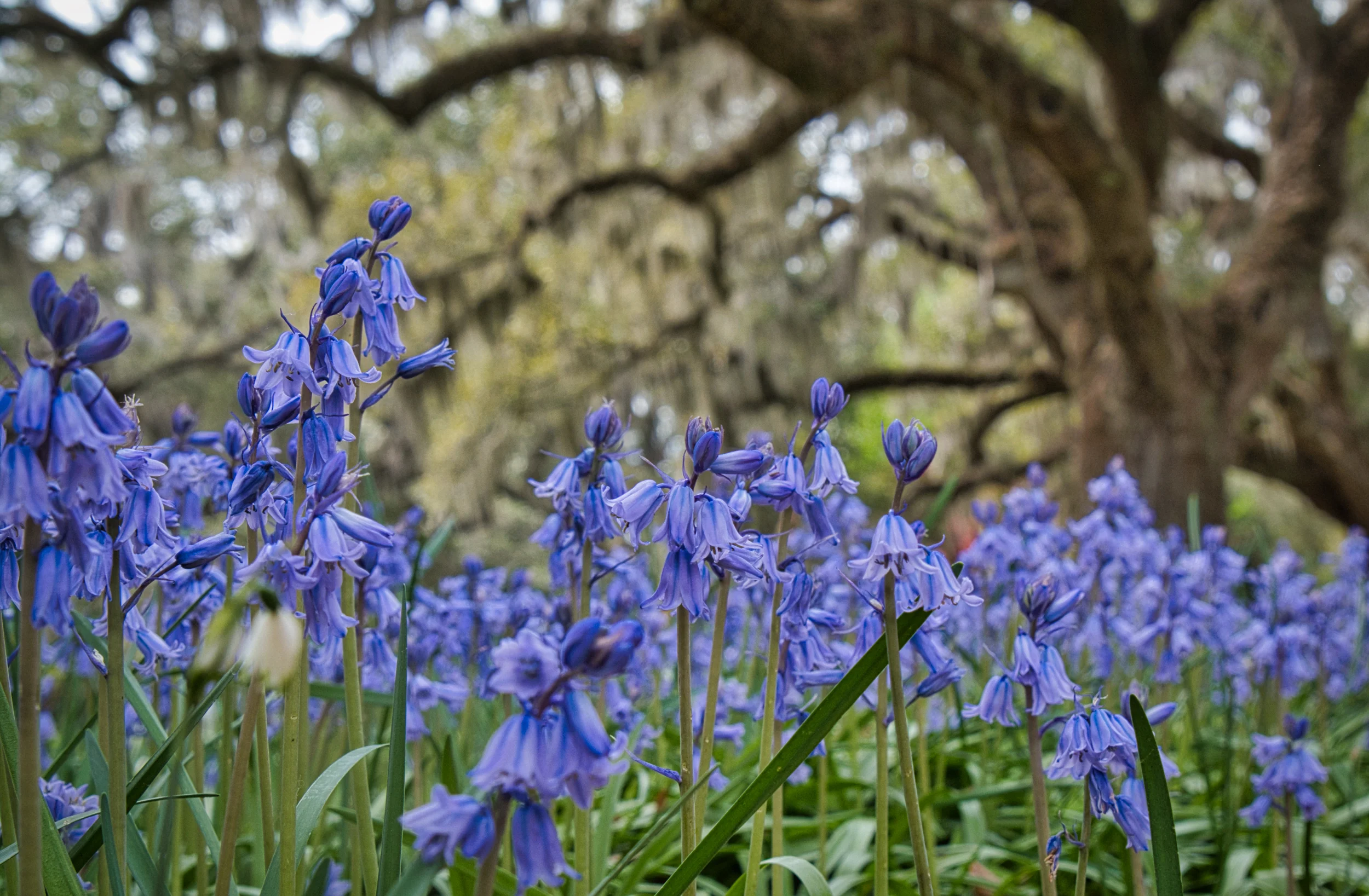 A scattering of Bluebells with brilliant colors thrive under the mossy live oaks at the Brookgreen Gardens south of Myrtle Beech, SC. This property is a stunning walk in the colors and scents of spring.