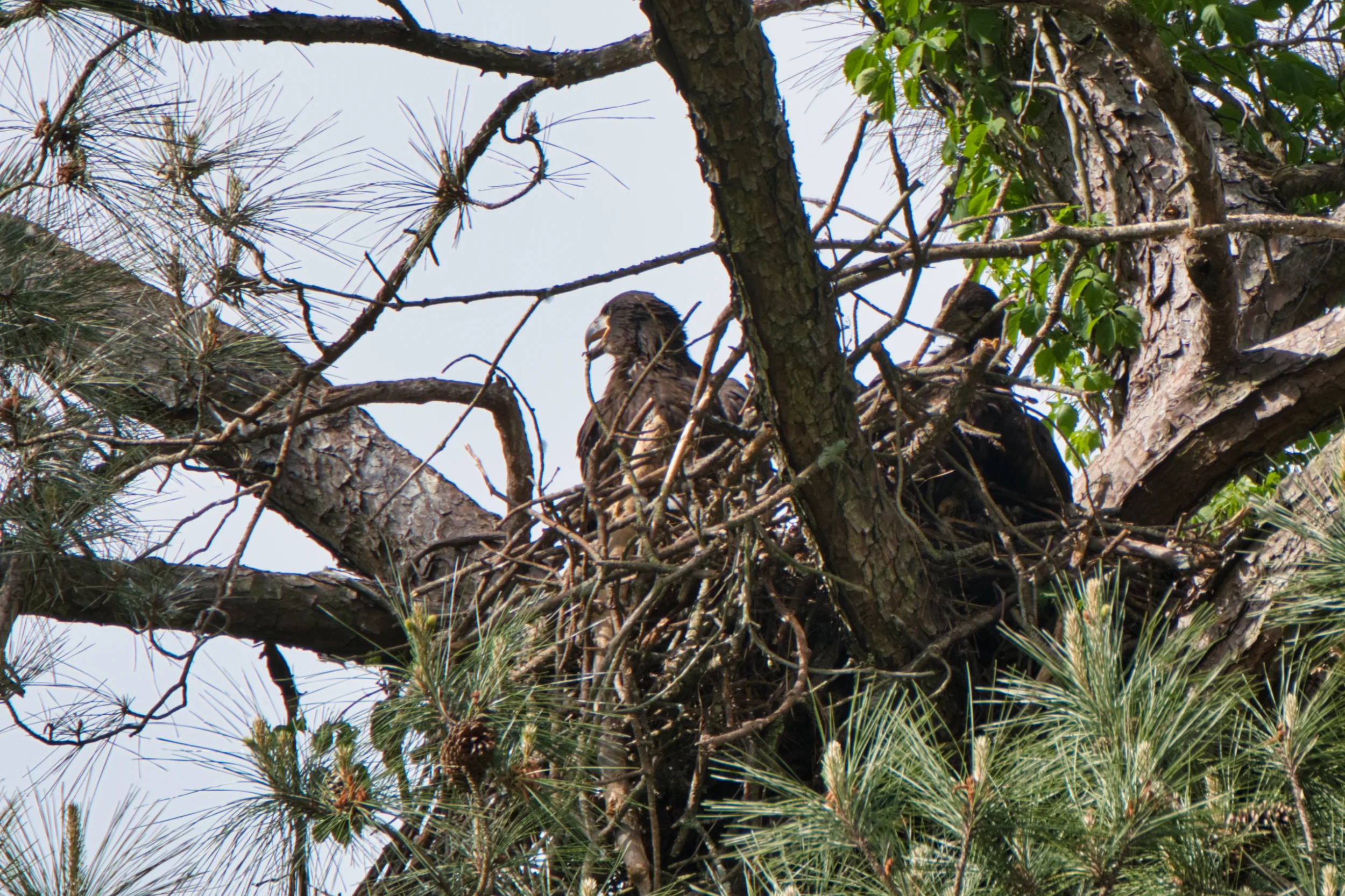 These two immature Bald Eagles, male on the left, female sort of hidden on right, are not quite ready to fly but the wind last week blew down their nest at Shelly Lake here in Raleigh. The male was uninjured, the female broke some tail feathers. It took a few days but they were rescued and are now in a wildlife center and both ought to be released this summer. My neighbor is one of the volunteer caretakers.