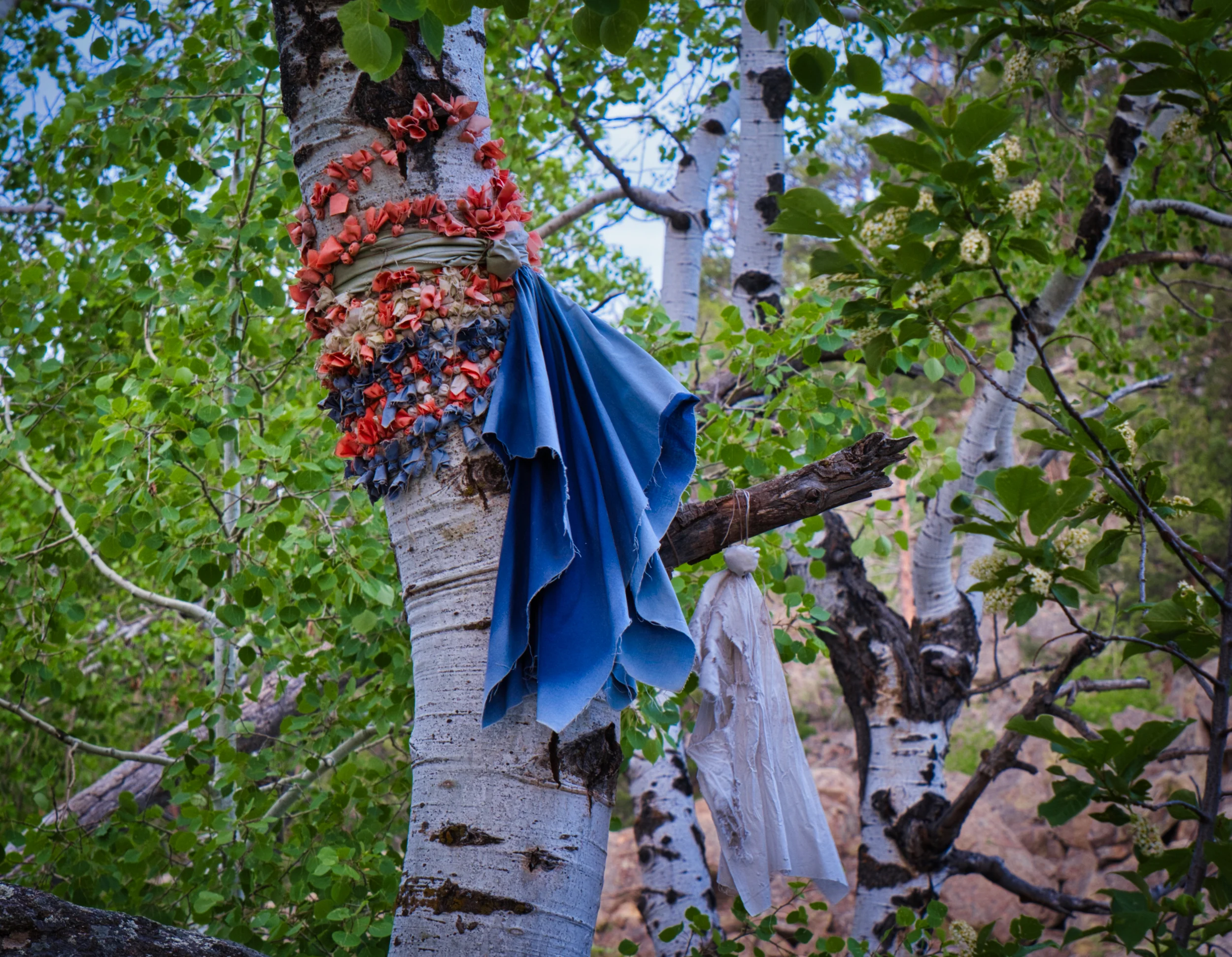 Native American prayer clothes are placed in trees are shrubs around the base of Devils Tower NM as it is a sacred place in their culture.