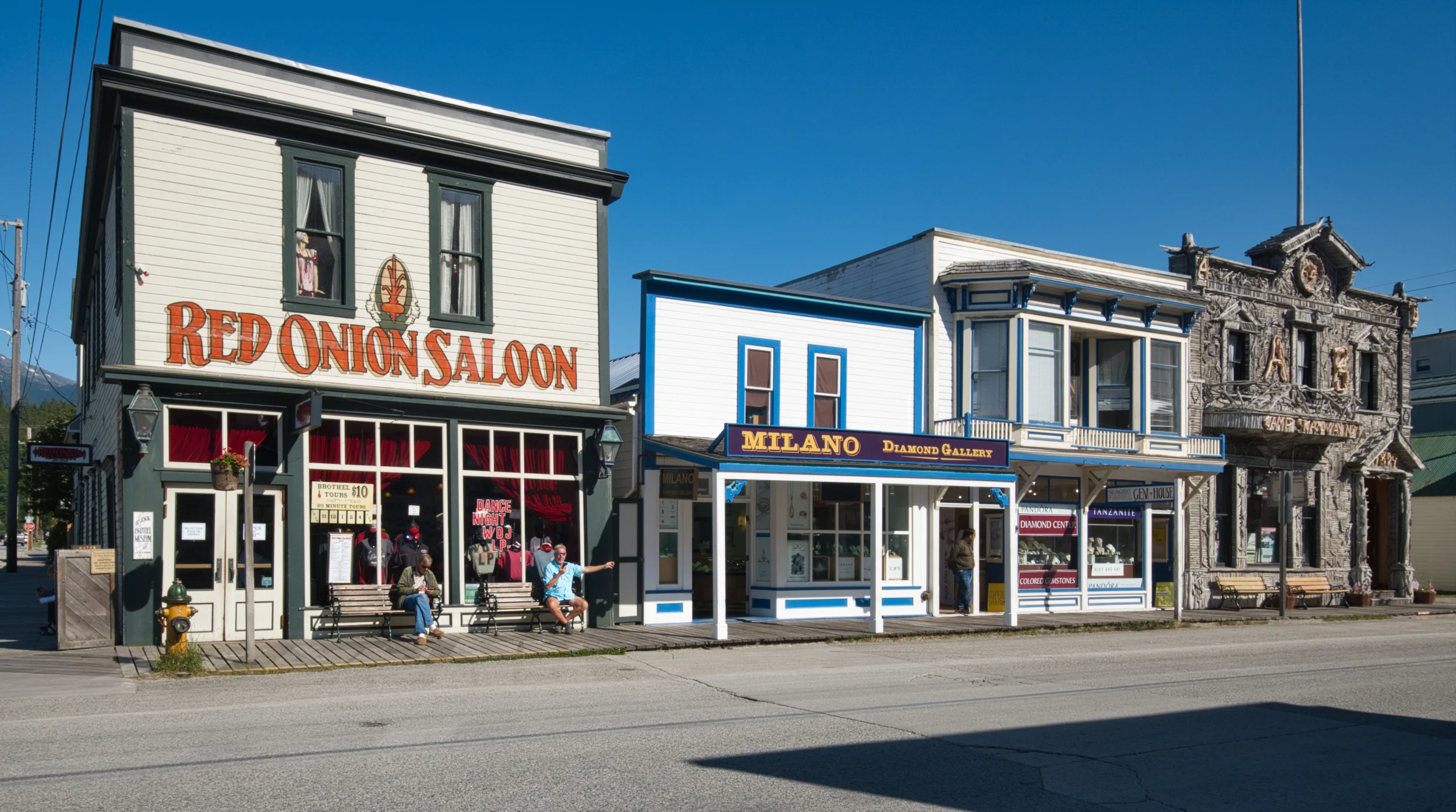 We made it to Alaska! State 49 for us and for them. We left the trailer in Whitehorse and drove the Klondike Road to Skagway. Superb road: lakes, mountains, alpine valleys, above the tree line for a bit and then down, what a drop, 3400 feet in 6 miles. This is the famous White Pass from the 1898 Klondike Gold Rush. That is another story. We arrived as the train that also traverses that pass was leaving town. Those folks were going to be pleased. The town has many, in fact most of the buildings are from the 1898 to 1920 era, many relocated from a nearby town, Dyea that died when the railroad opened in Skagway. The National Park oversees several of them and a nice VC. We took two tours one of the Jeff Smith’s Parlor and one of the town focused called Gold Rush 101. Ranger did an excellent job. Between the two we walked the town carefully avoiding the hoards of gem and jewelry sales people- not an easy task.