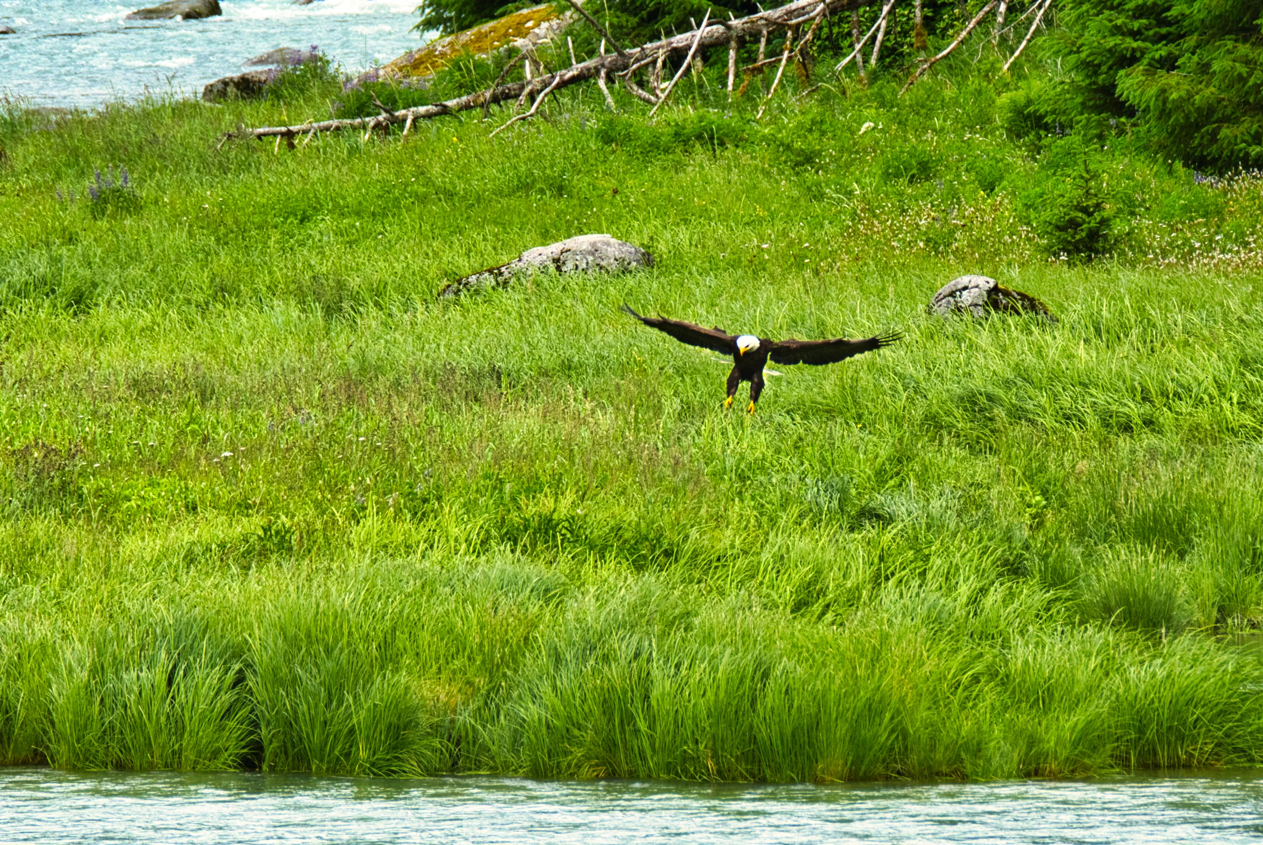 There were no church options in Haines that we were willing to try, our first Sunday to miss and it felt odd. In the morning we went to Chilkoot SP hoping to see wildlife along the lake and river. I did get to add a new bird, a Varied Thrush. I saw the bird only because there was a lady leading a nature tour and she pointed it out. I was not able to photograph it. The place was, predictably, beautiful. We watched mergansers in the river and several eagles. I got photos but not the one I want yet. We spent the afternoon doing trailer chores, laundry, some poor, spotty internet at a coffee shop and packing for Sitka. In the evening we did a hike in the rain forest that was enchanting.