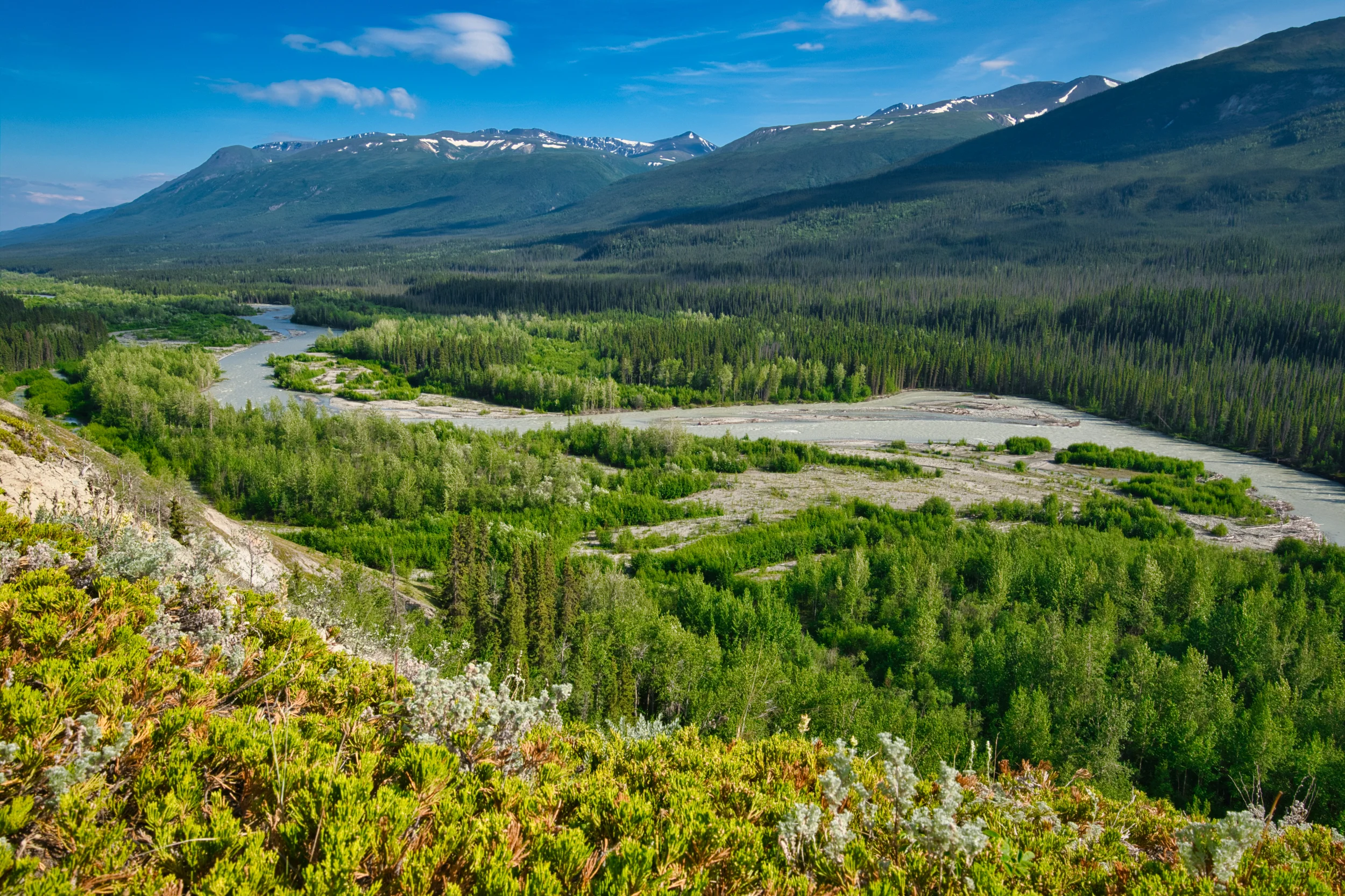 Tomorrow we are going to drive the infamous McCarthy highway. 60 miles of former railroad bed to reach Kennicott and the main part of Wrangell St Elias NP. To do that we only drove about 90 miles today to a small park at Kenny Lake only 30 miles from the start of the road. After we found the park we set up the trailer and went to the M-SE NP VC where we took a walk with a ranger though a small trail in the boreal forest, informative. Nice place with an excellent movie on the park as well. Lunch in the parking lot and then we found a nice trail to a cliff overlooking one of the many raging rivers crisscrossing this area. We spent the evening packing for the short distance / long drive and our overnight at the lodge.