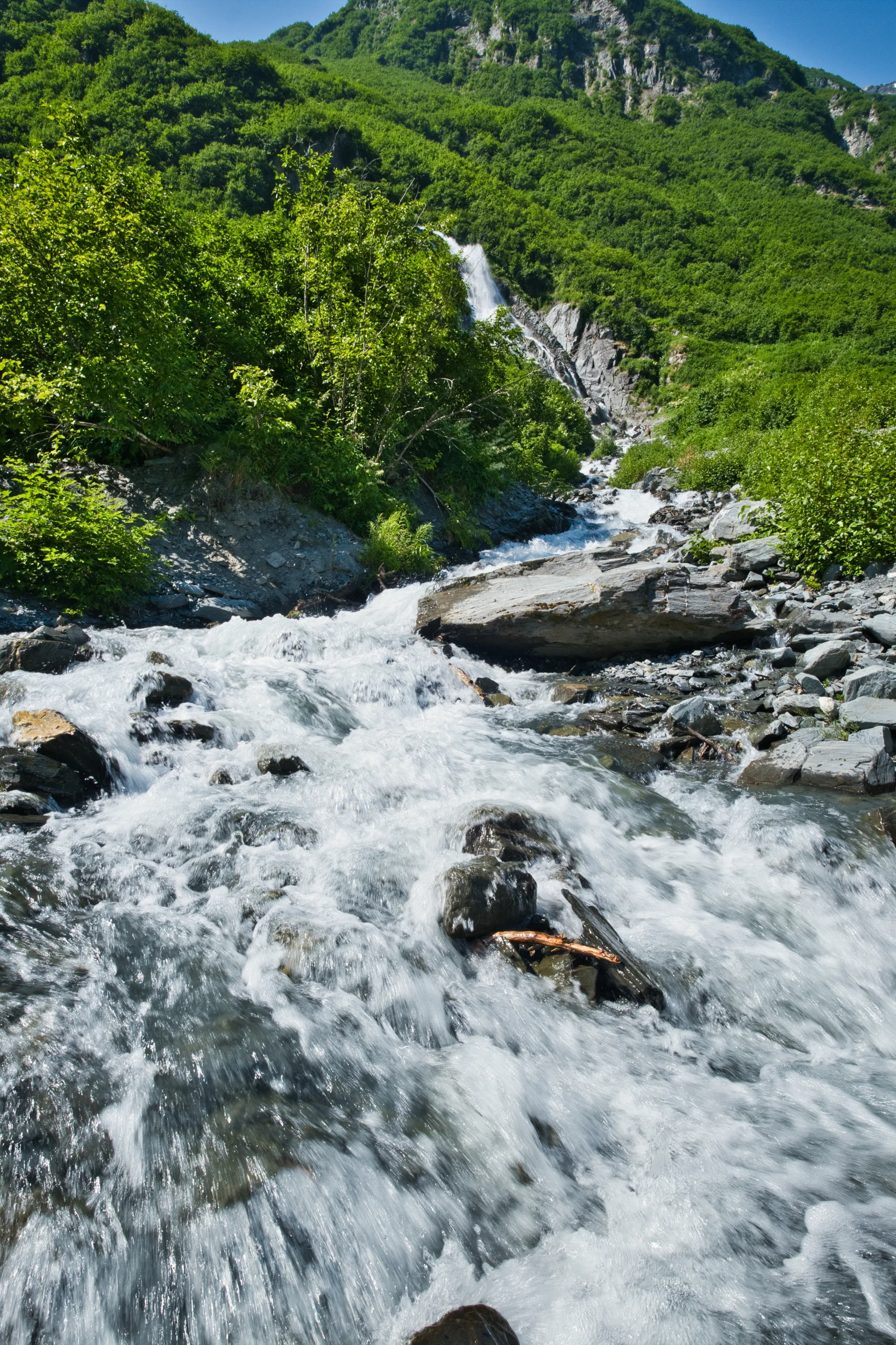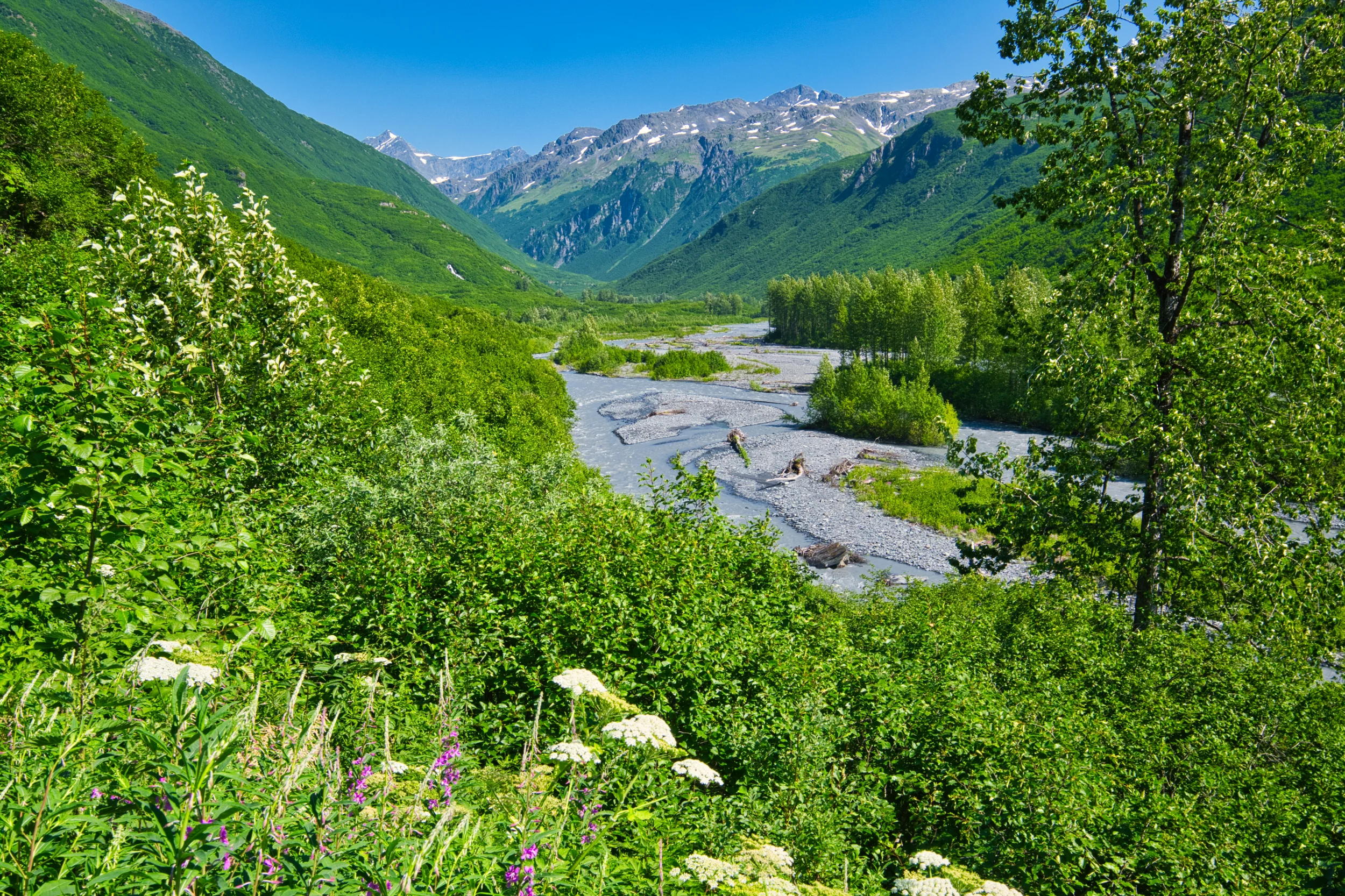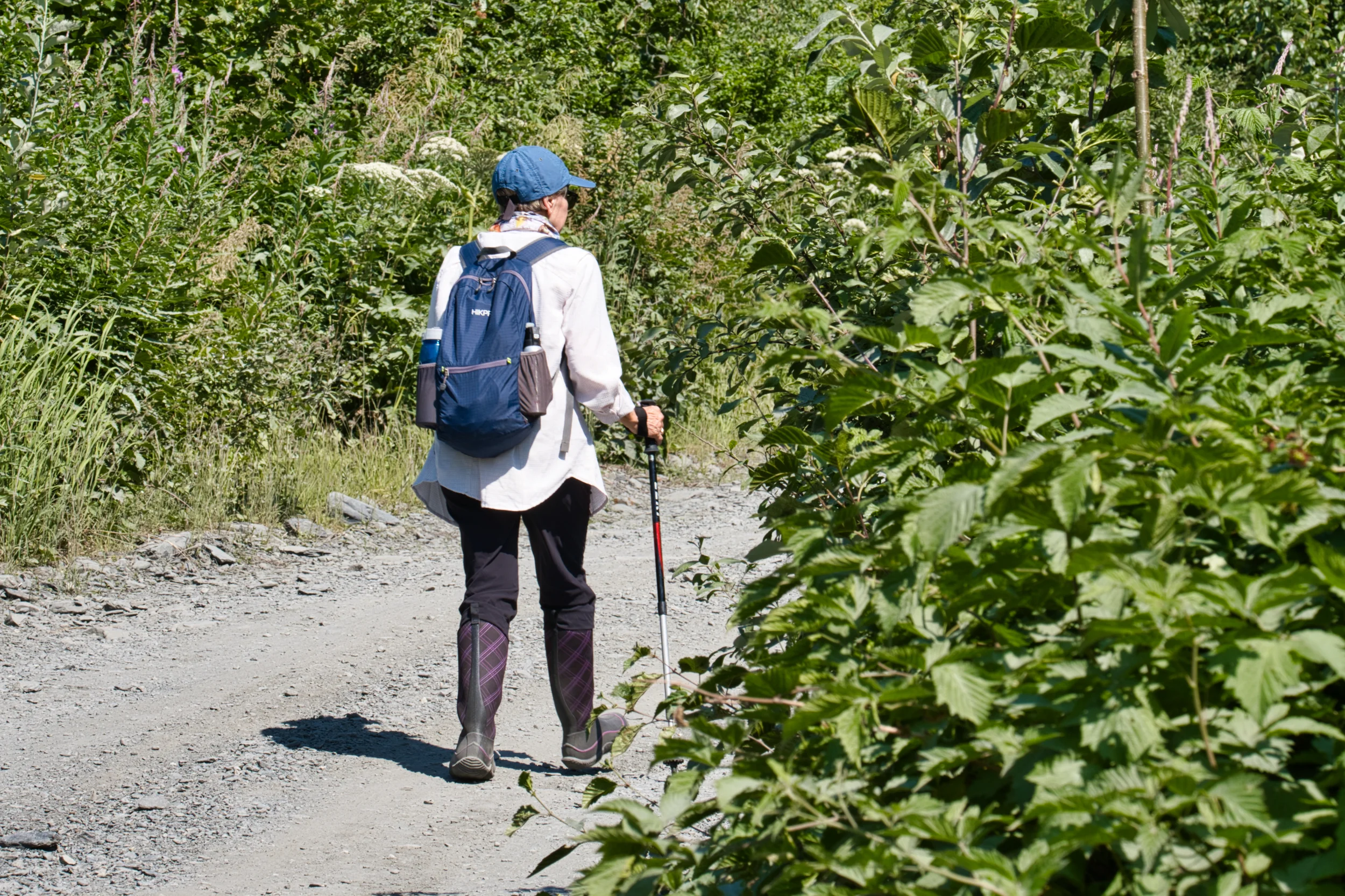We are on slow today. Very. We did laundry in the AM and Laundry in the PM and Laundry at supper time. Which by the way was left over salmon and scallops with a nice green salad. In the afternoon we did a 4 mile or so hike up a valley on the Mineral Creek Trail. We pictured something along the river under trees. Not quite. It was a gravel road that had a wash out that we could not cross but ATV’s and 4wd could so they would pass us in a cloud of dust. Mostly we were by ourselves. It was hotter than expected, we had no shade, it was full of black flies and more. Oh, and we wore Alaska Sneakers to get across the water. Fashion setters for sure. The sides of the canyon were covered in green with streaks of water and scores of waterfalls pouring down both the western and eastern sides. Really neat but did I mention the bugs? Or the Heat? Or the dust? The afternoon really got fun as we washed the truck, repacked the storage boxes, washed the trailer floor, changed the sheets, took out trash etc. And you thought we were not having fun. Tomorrow is a very special day on the water.