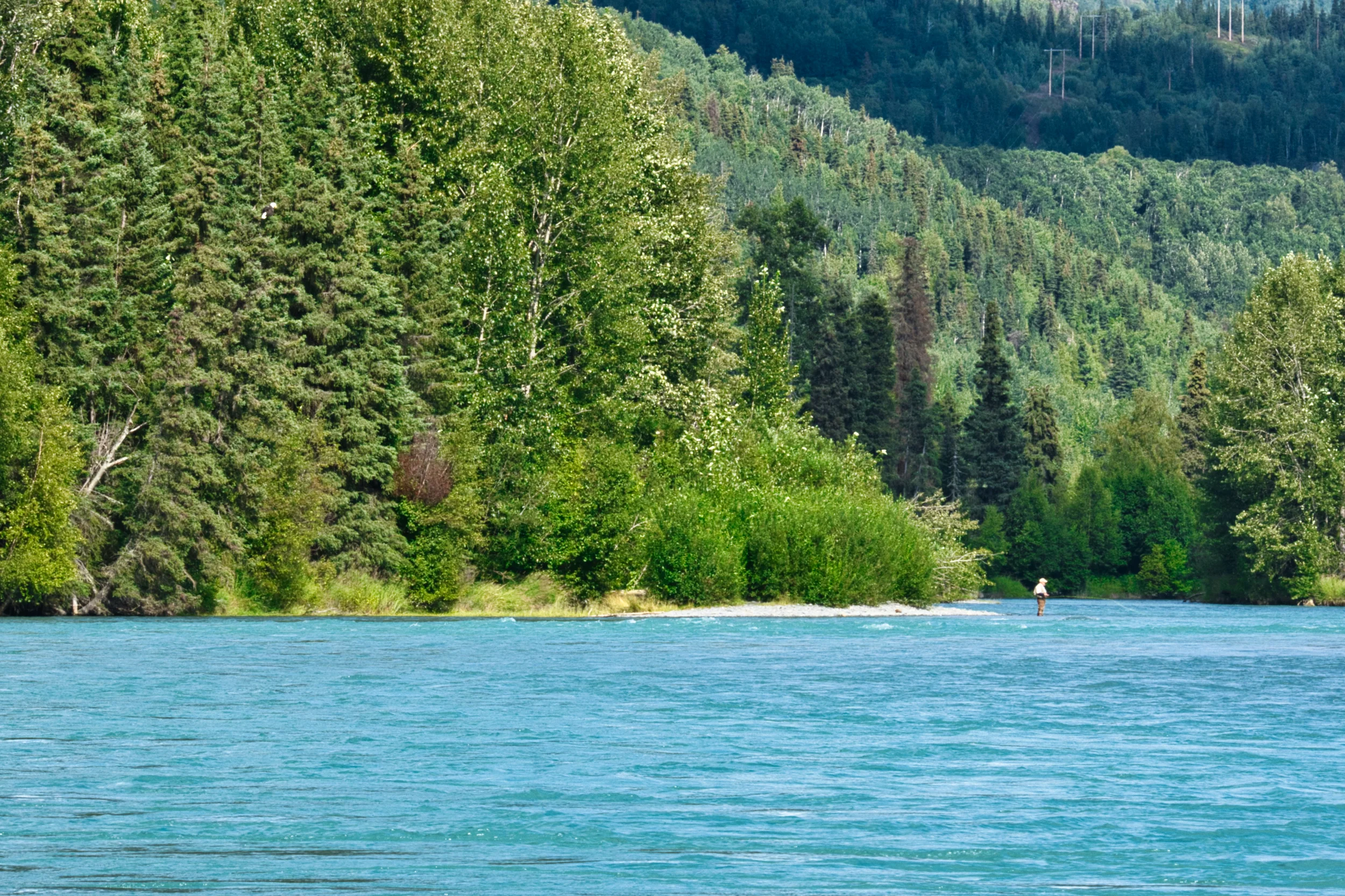 This is a lone fisherman, in a glacier fed river, being watched by a lone eagle. Solitude, bracing water, spruce forests and salmon. Alaska Norm