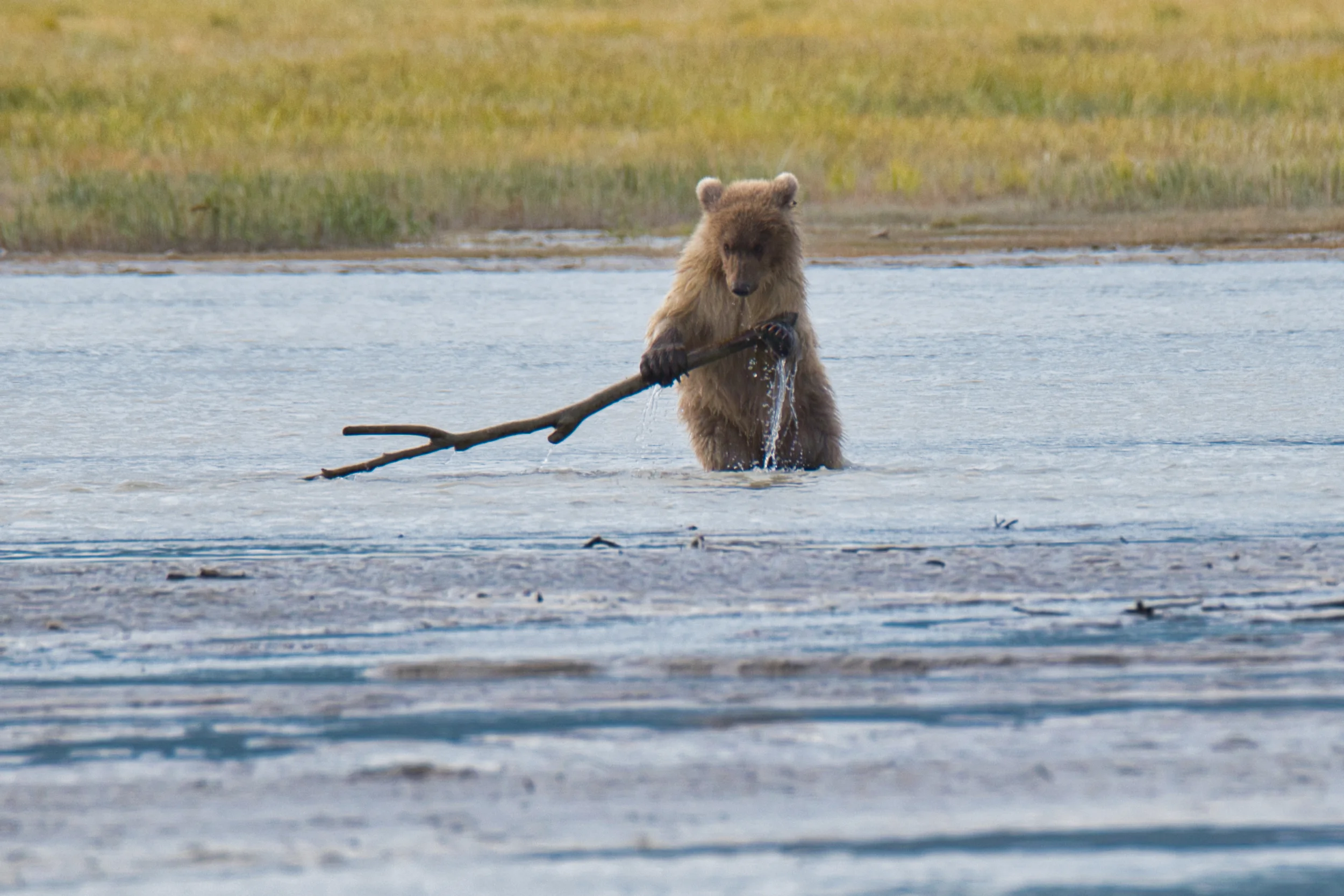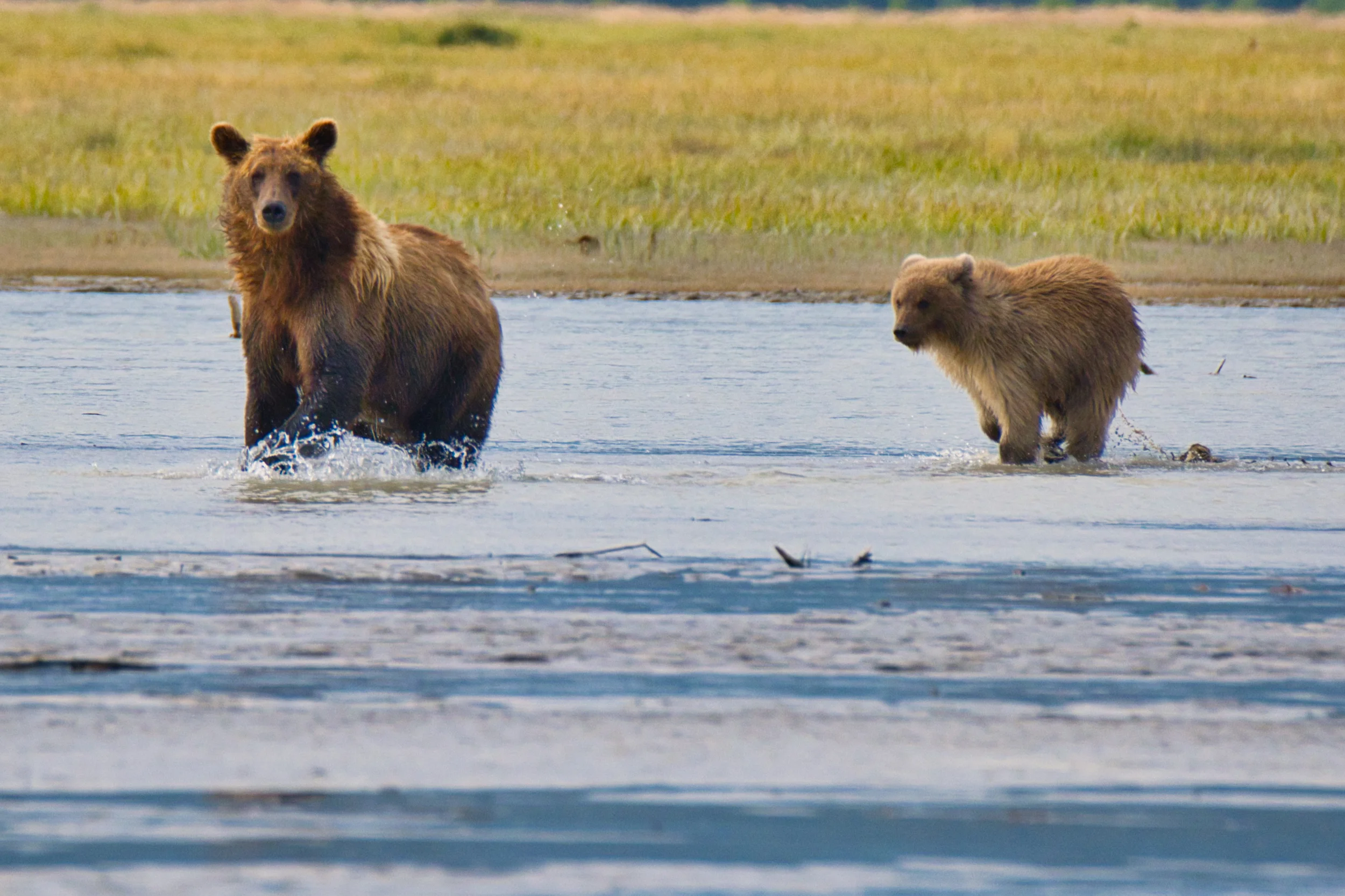 Then in the late afternoon, Tom and I lifted off in a seaplane for Lake Clark NP (Number 239). We landed in Chinitna Bay that boarders on the park. Then we transferred to an airboat like you usually see in the Everglades - were told it is the only one in Alaska - and off skimming across the mud flat and the silted glacier water in the very shallow bay to view bears. We saw a mom and first year cub and watched them a long time, then an older big bear caught two fish as we watched from a different vantage point. The captain then moved us closer to a couple of other bears who emerged from the tall grass but they did not really come too close. We saw more at a distance then took a long ride to another vantage point off shore where four younger, active bears were fishing. One went back to the grass but the other three walked straight toward us with one curious fellow stopping about 25 feet from the boat first to stare at us (HP-O as Cadillac would say) and, then picked up a fish and chose to eat it facing our boat. Amazing. Along the way we also spotted eagles and gulls, a large flock of loons and, for me, the fourth new bird of the day, Greater White-fronted Goose. We landed back in the home base lake and taxied to the dock about 9 that evening. Spectacular day!