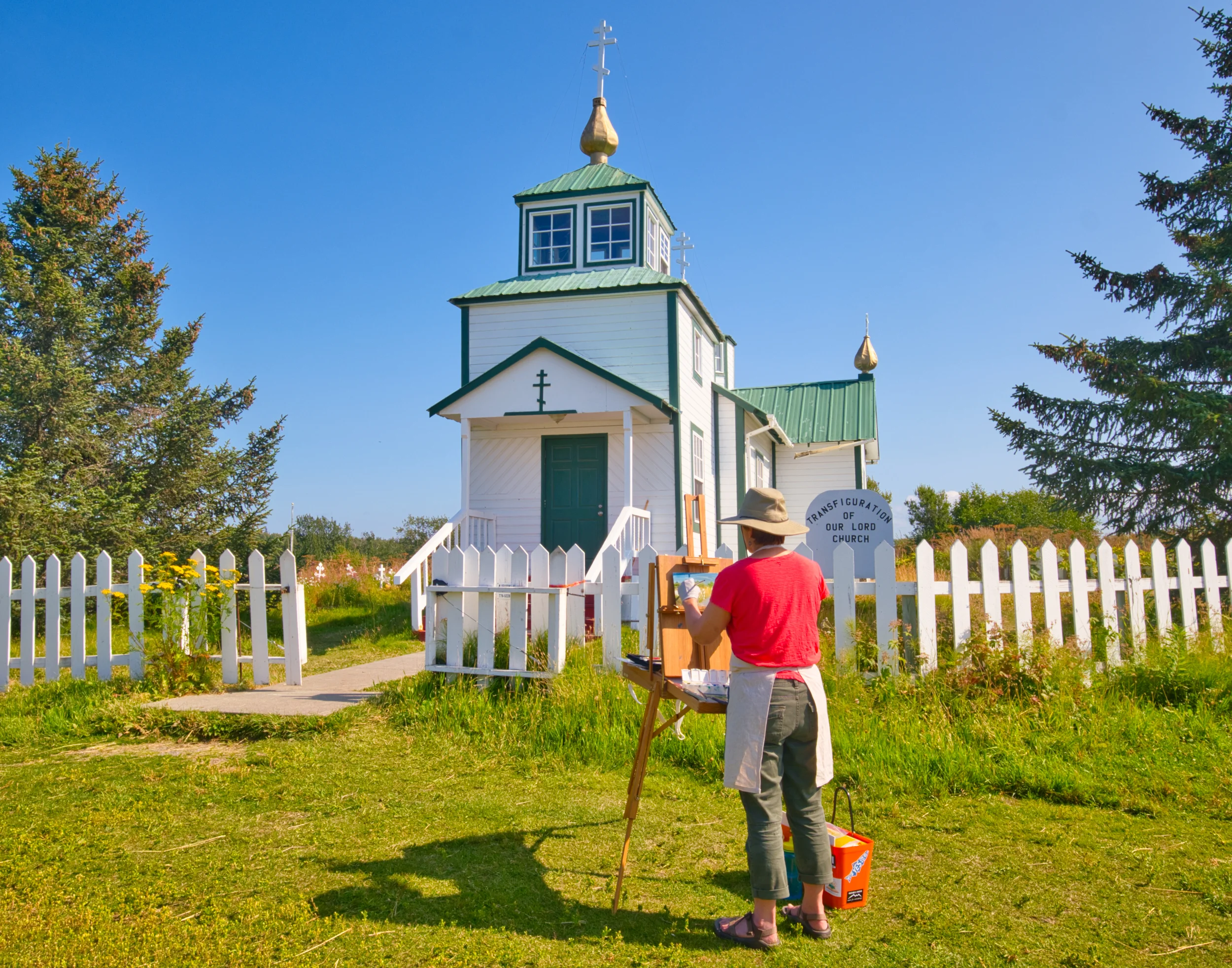 Fresh Air Color /August 18, 2019 by Dave Hileman 1900’s era Russian Orthodox Church and, Pam, who is painting in the nice afternoon air high on the cliffs over Cooks Inlet.