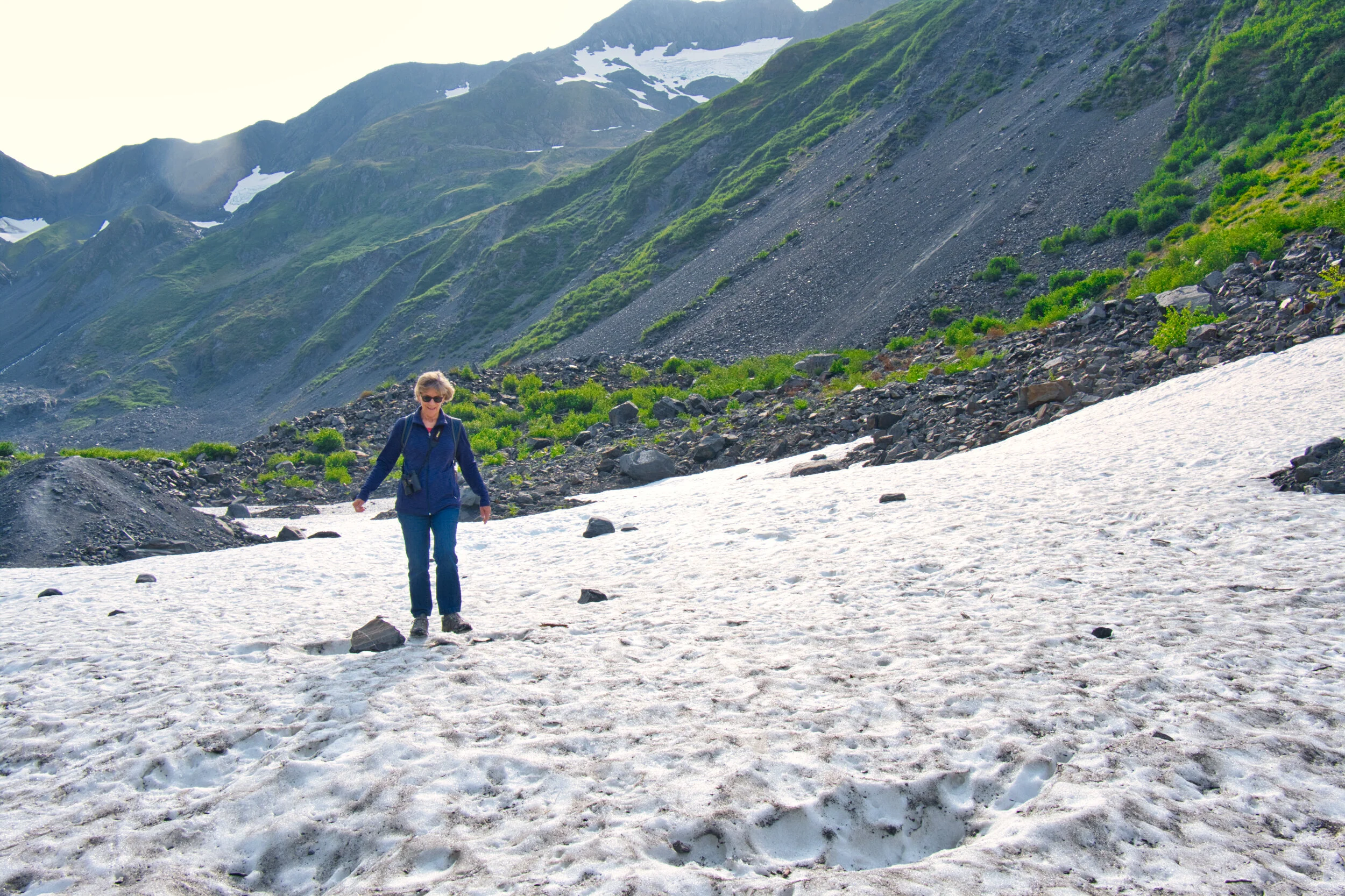 Cindy, looking lovely yet windblown as she makes her way toward a glacier across this snowfield, celebrates a birthday today.