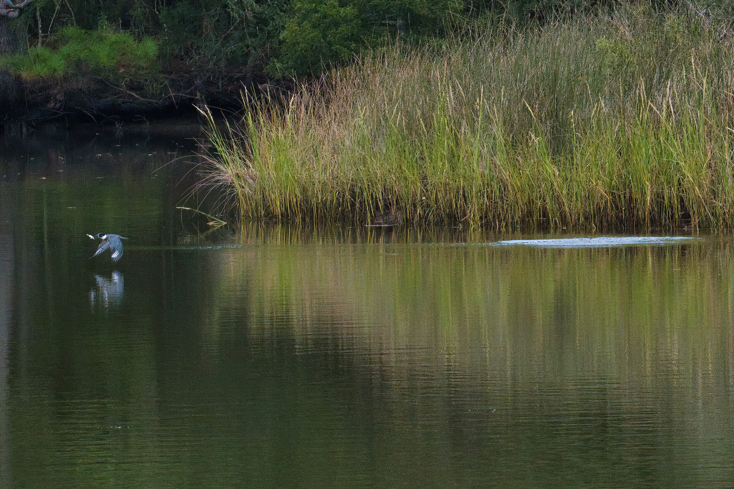 I have tried to get a good image of a Belted Kingfisher many times and failed. Last year a finally got a decent photo, not exactly what I wanted but pretty good. A few days ago in the Davis Bayou - a part of the Gulf Islands National Seashore, I got one just after he dove into the shallow water and emerged with breakfast. I was actually here to practice birds-in-flight and there are usually pelicans here. None that morning, So an egret or two, some osprey and this nervous, skittish, erratic bird calling and fishing. I used a long lens and a fast shutter and still nearly missed. You can see the ripples where he entered the water and the trail of dripping water that leads to him on the left edge of the frame.