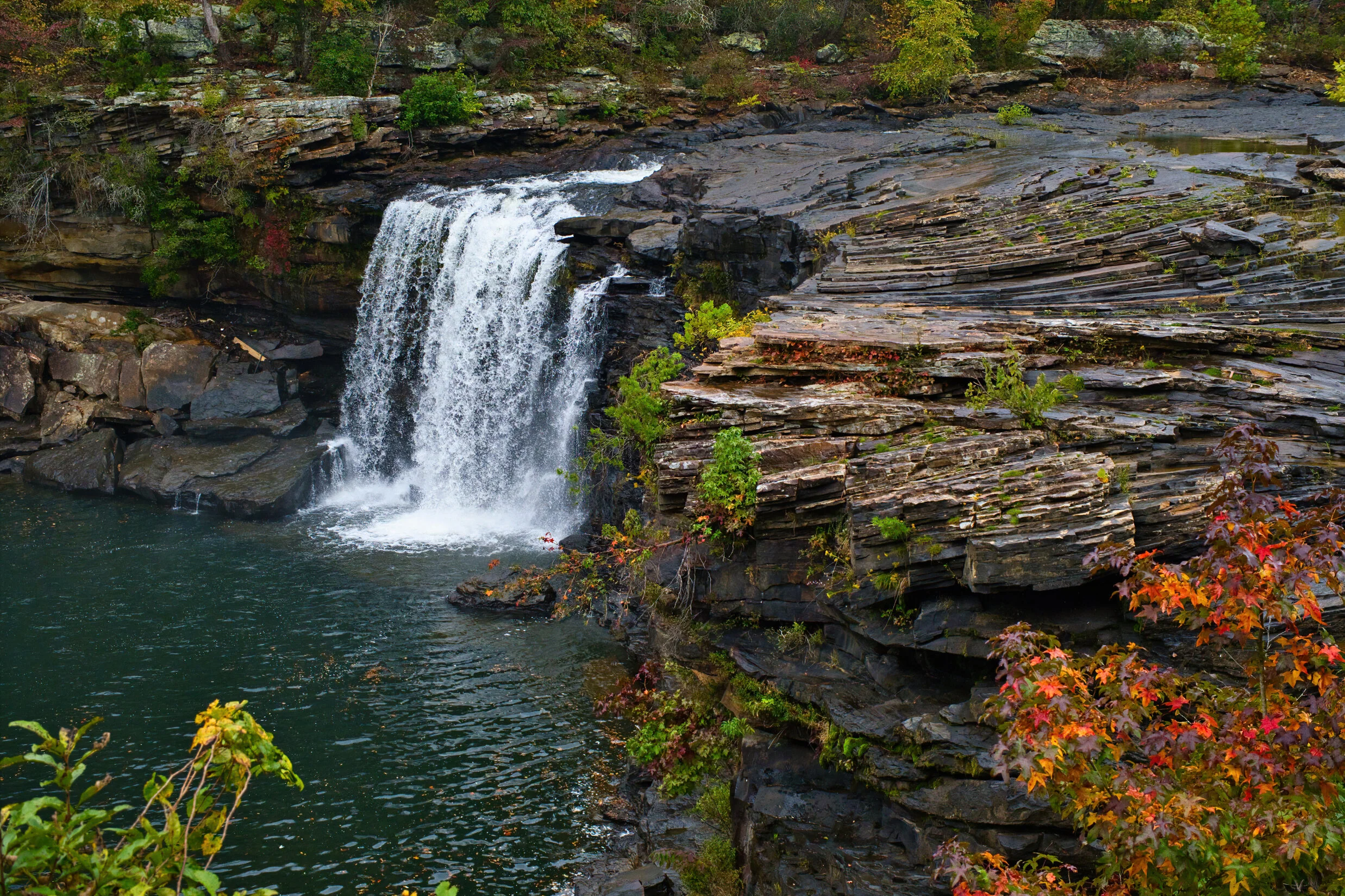 In Northeast Alabama, a surprisingly mountainous area to me who had never been here before. Quite a nice place. We were here for the Little River Canyon National Preserve in a valley high in the hills with this water fall marking the start of the canyon. It is an 11 mile drive along one edge with a few places to pull over for views or very shot walks. Kayaks are popular for the trip through the valley but we saw none the day we were here.
