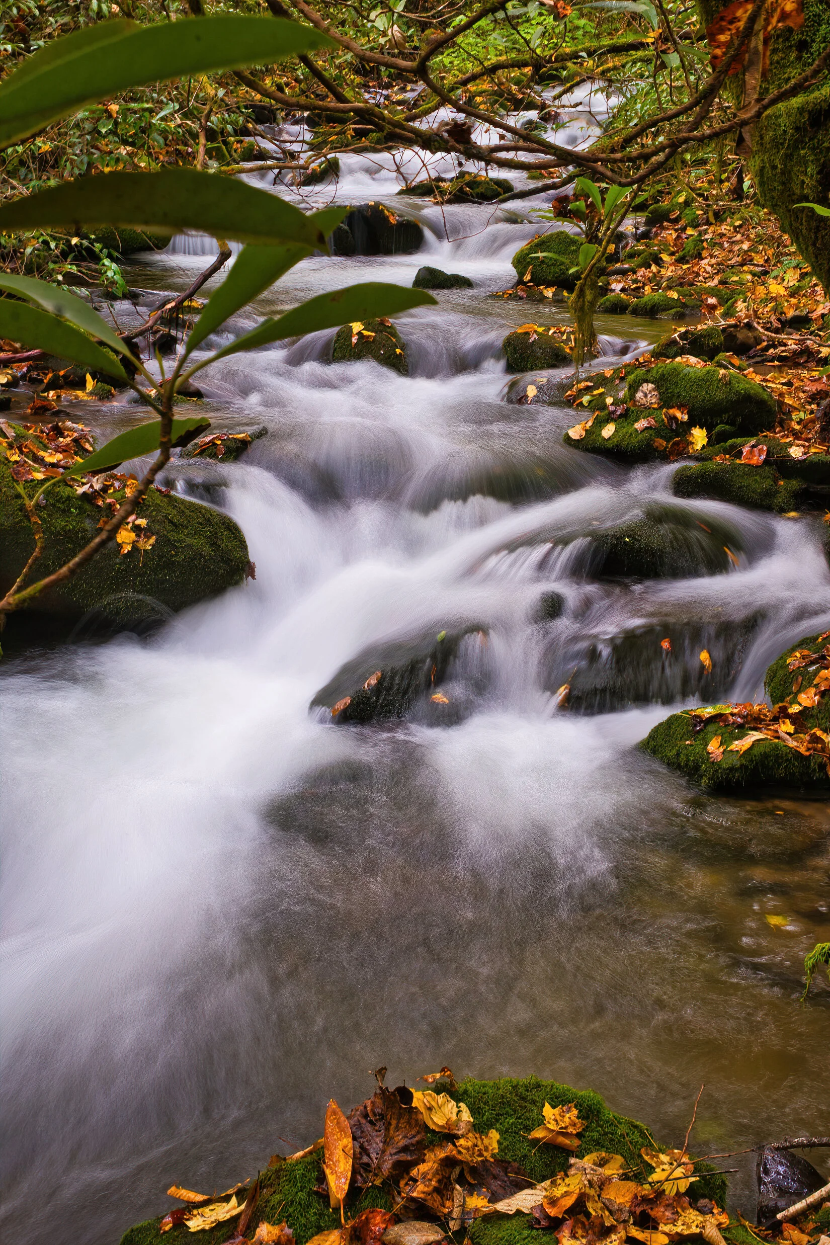 One of the many beautiful streams in the GSMNP. This one is strewn with leaves in the late Fall. Color higher up the mountain and we will head there Thursday.