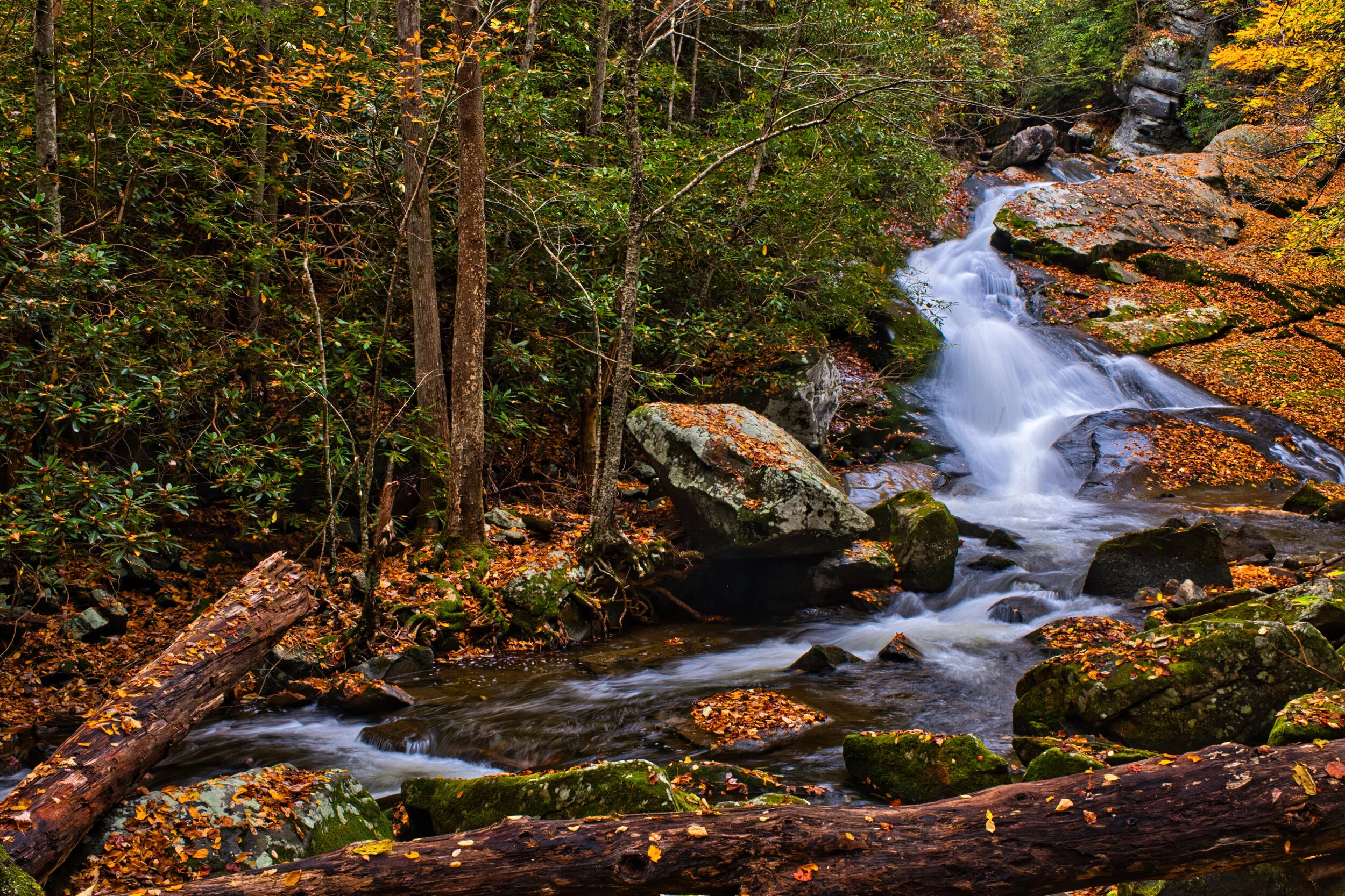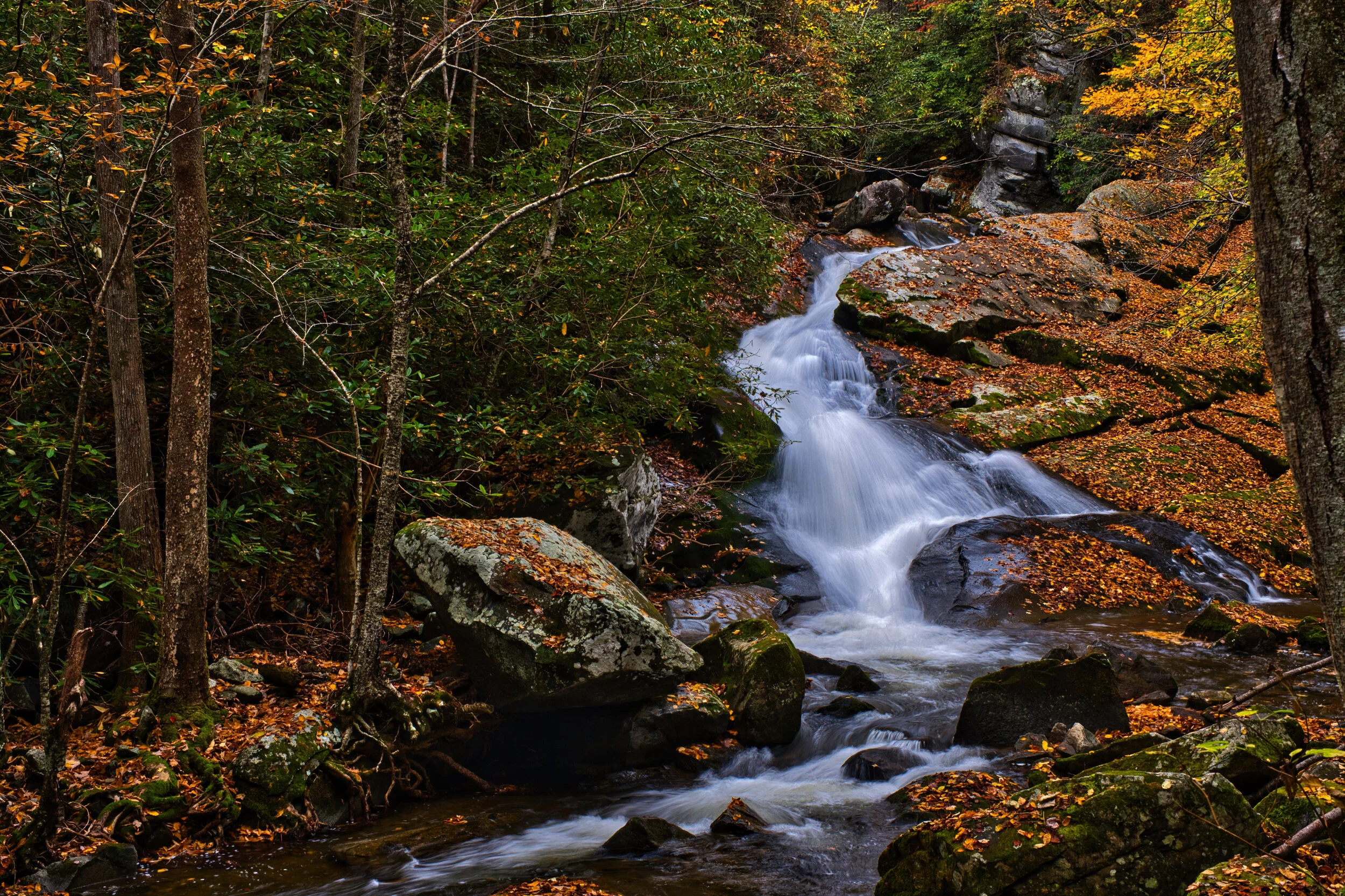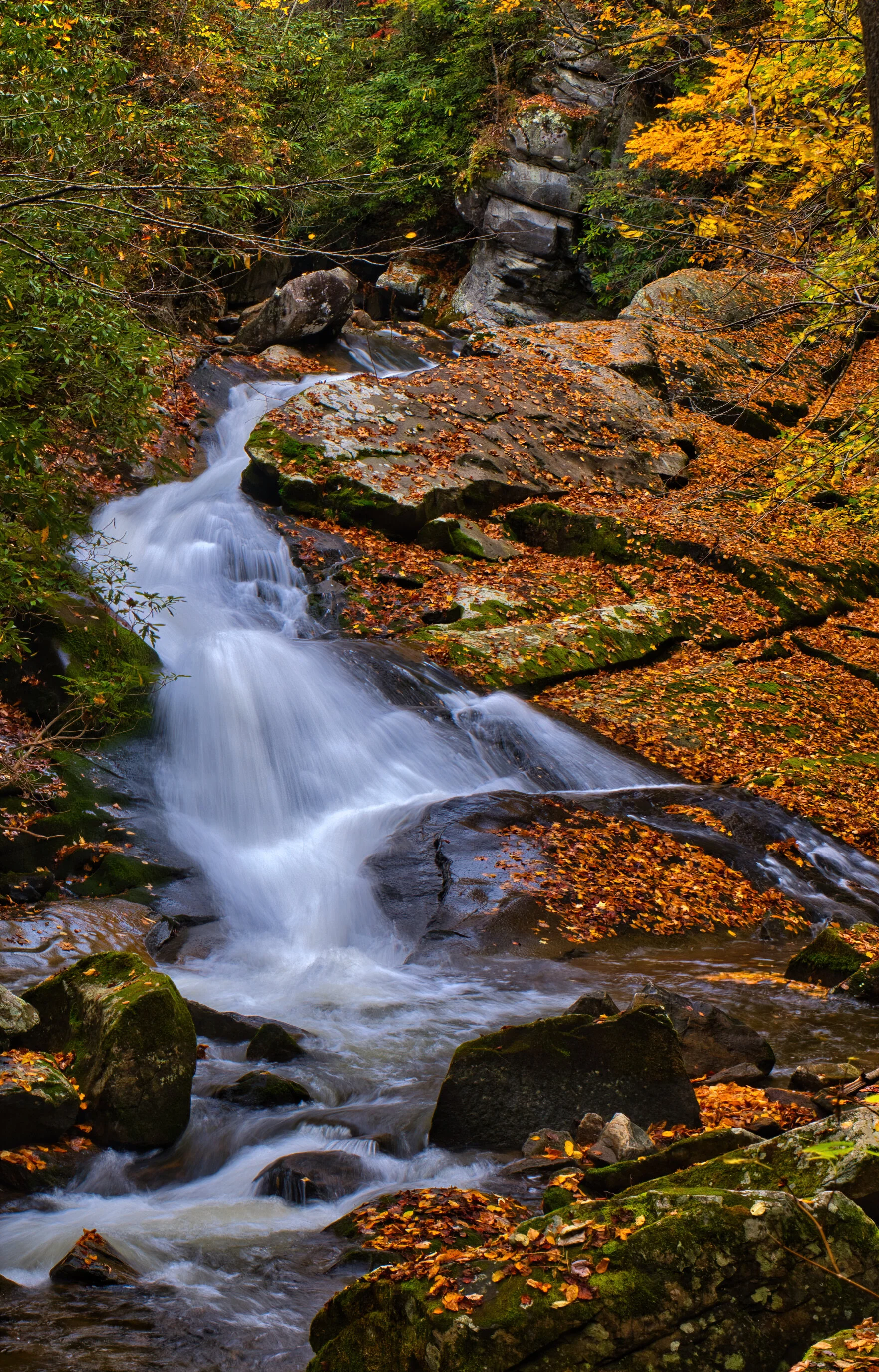 One of my favorite areas of the park is near Tremont. There are several waterfall, nice hiking trails and an easy 2 miles or so of road hikes. And this stunning cascade only about a 15 minute walk from the parking area. It attracts many photographers who perch on the single bench along the road or set up tripods near by. I chose to clamber down from the road about 25 feet to get a different perspective. Not sure what I achieved but I still like the photo. The whole cascade extends a bit more off the edge to the left and quite a bit more on the top. Still the colorful leaves that coat the rocks add a nice dimension to the scene.