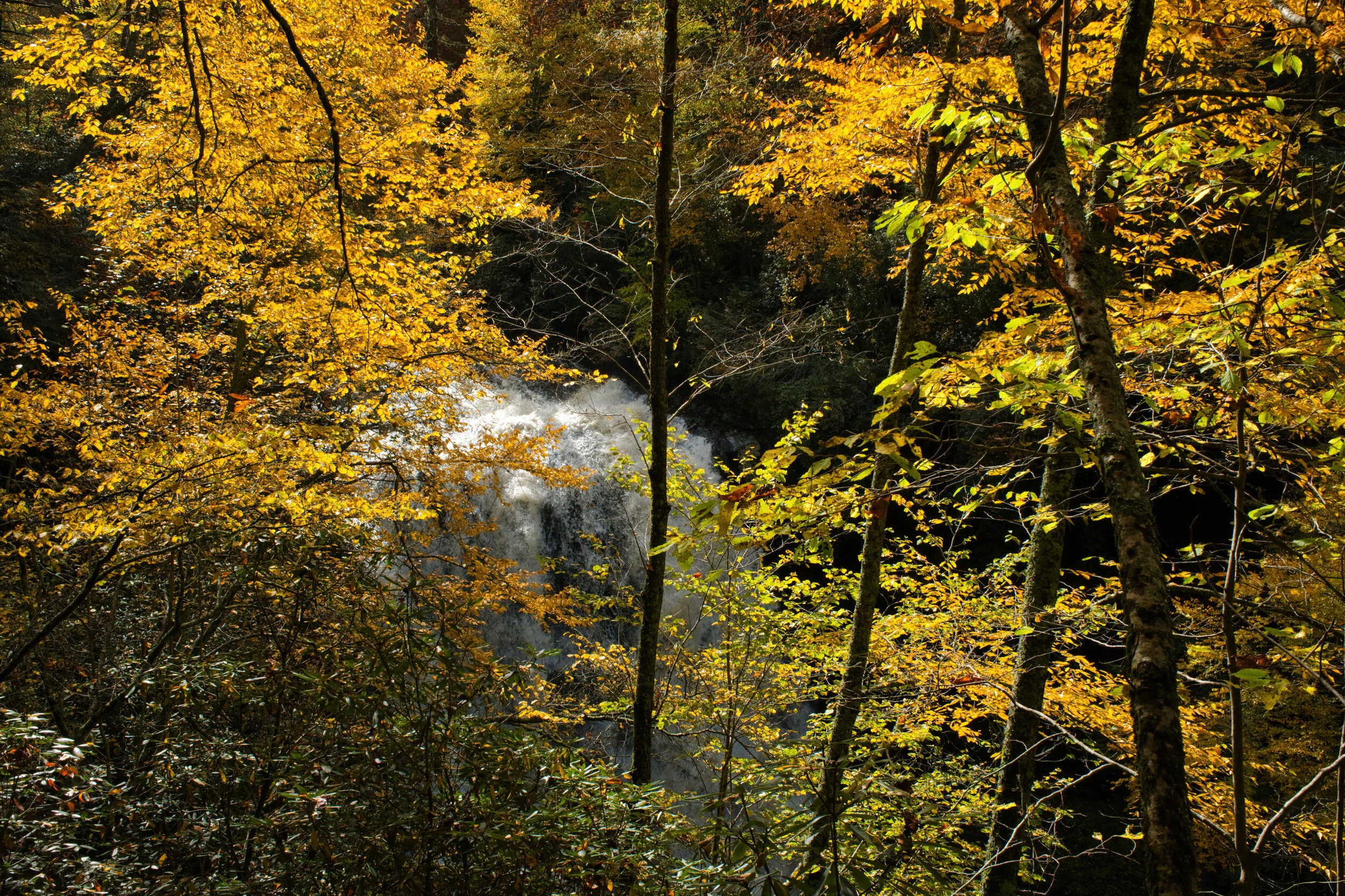 Rainbow Falls is one of the most popular short hikes in the Smokys. It is so popular that the path of over a mile is paved. We were there one day with a few hundred close friends all of us walking a few feet apart but when you arrive at the falls it was crowded. So CJH and I went past the falls almost now alone on the trail and I saw the top of the falls through the colorful trees and liked the perspective.