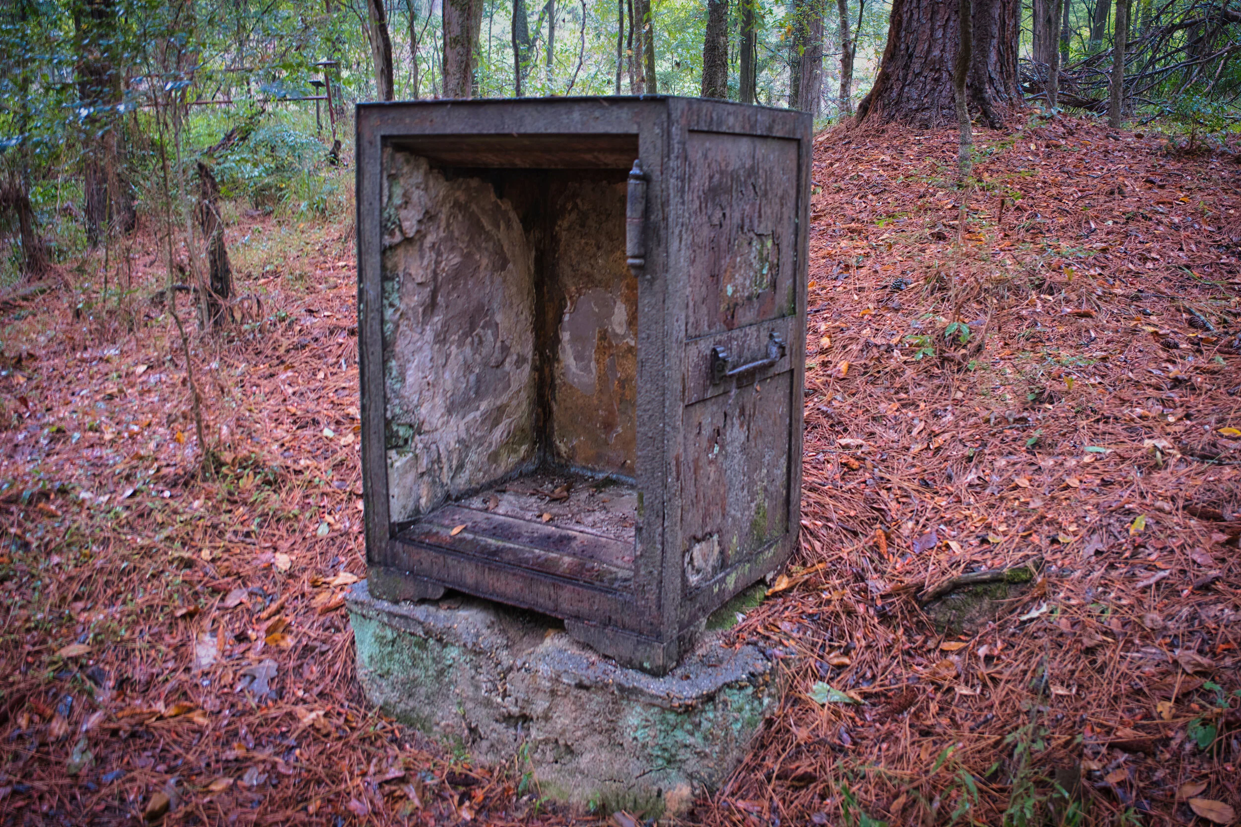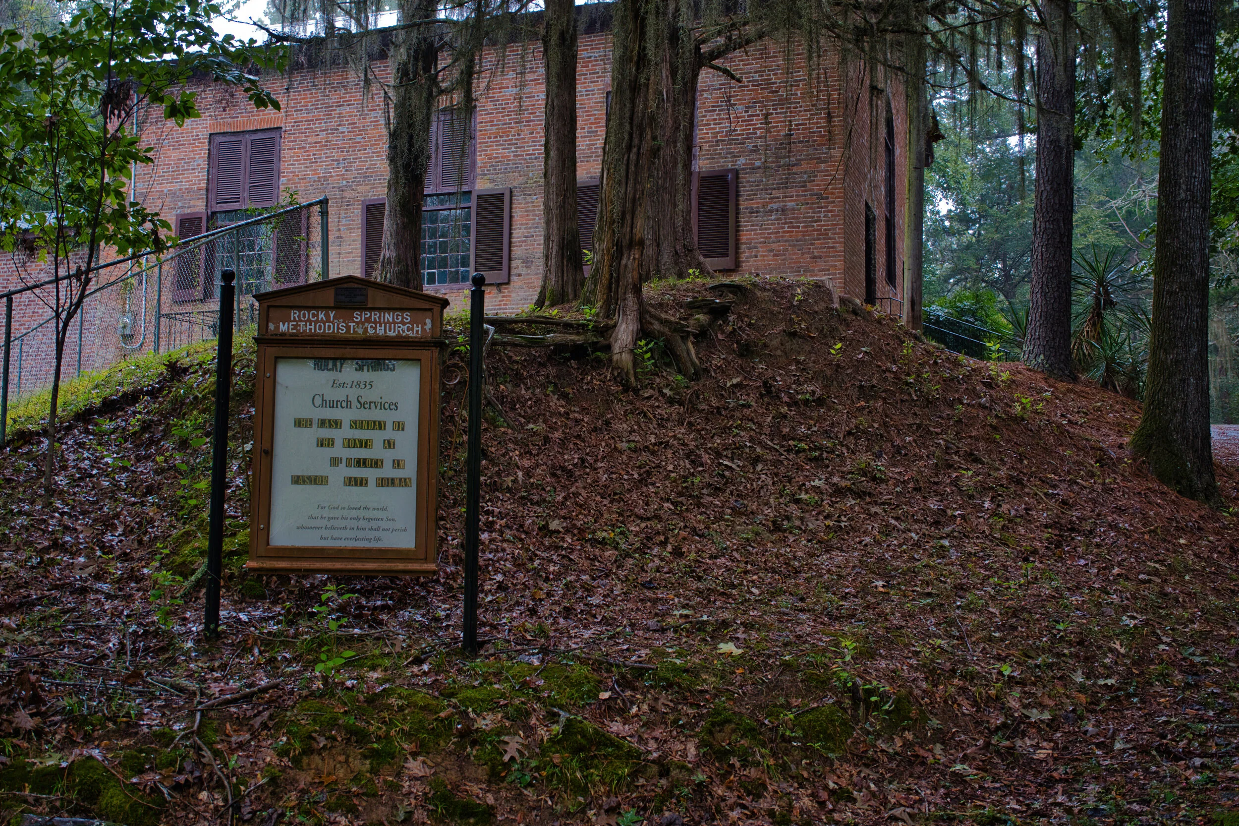 On the southern end of the Natchez Trace you can take a short drive to the town of Rocky Springs, MS. Don’t plan on finding a place for lunch, or gas or actually anything unless you are there the last Sunday of a month in the morning because there is still a church. And a safe. All that is left of this once large (1000 plus people) and thriving town are a few bits of foundation, a cistern or two and two old safes with no doors. Changes in the trace, travel, roads and both war and disease gradually eroded the town until the 1930’s when the depression caused the last people to leave. The nearly 200 year-old church is the only structure there and it was hard to reach in the rain. A fence closed off most of it and a muddy hill was also effective in keeping me away. So this shot is all I got and the safe. It was a lonely place, in the rain, no one around and just felt eerie.