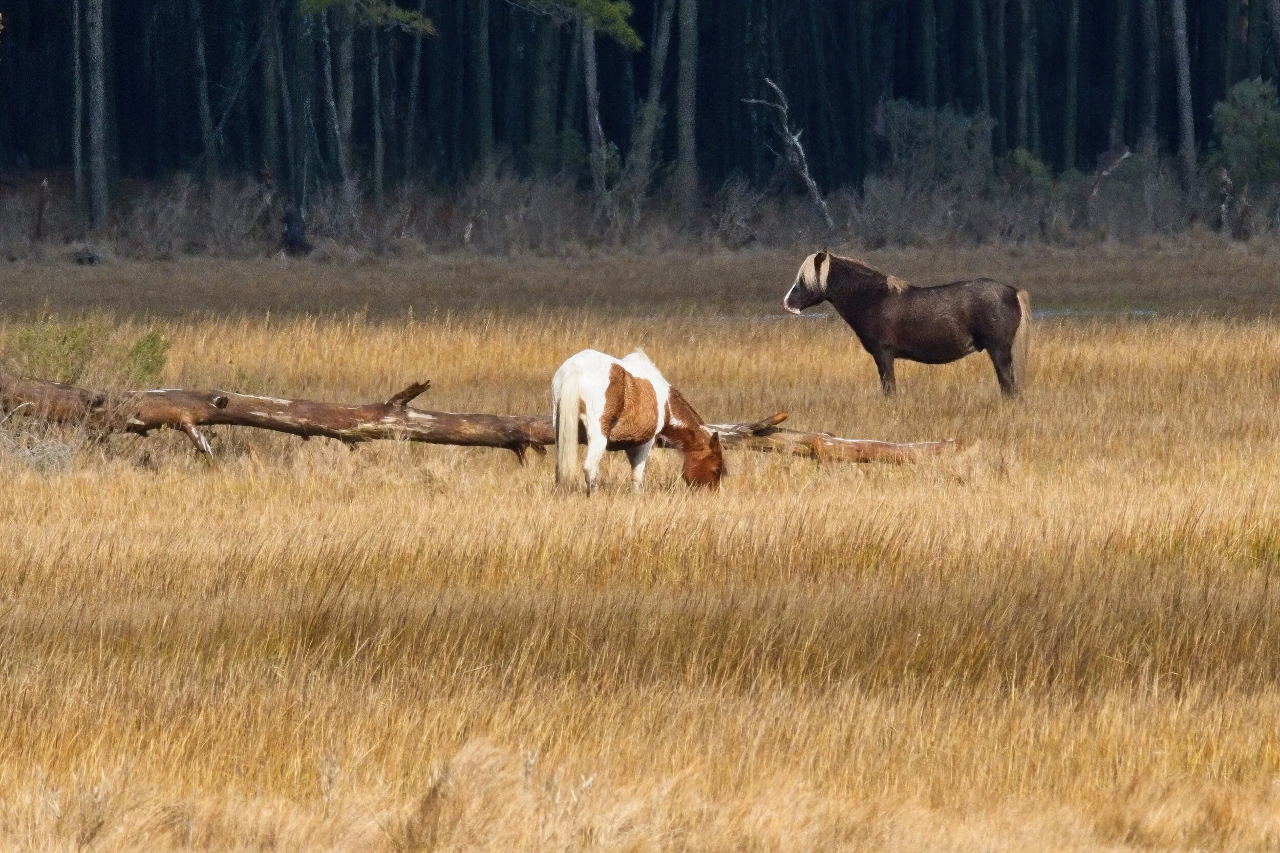 The name Chincoteague Pony is an official breed. The fire department and scores of volunteers (saltwater cowboys) bring the herds into pens during June to prepare them for auction in July after the famous “Pony Swim.” Some are sold and leave the lsland a few are “sold” but called “buy-backs” and the buyer gets to name the horse but it stays with the herd. The male in this photo, Riptide, is the son of a famous horse and now is the alpha male of the southern herd. The other pony in the photo is “Get Milk.” These were a quite distant today and trying to stay a bit out of the wind which was blowing 30 to 50 mph. Smart horse - less smart photographer..
