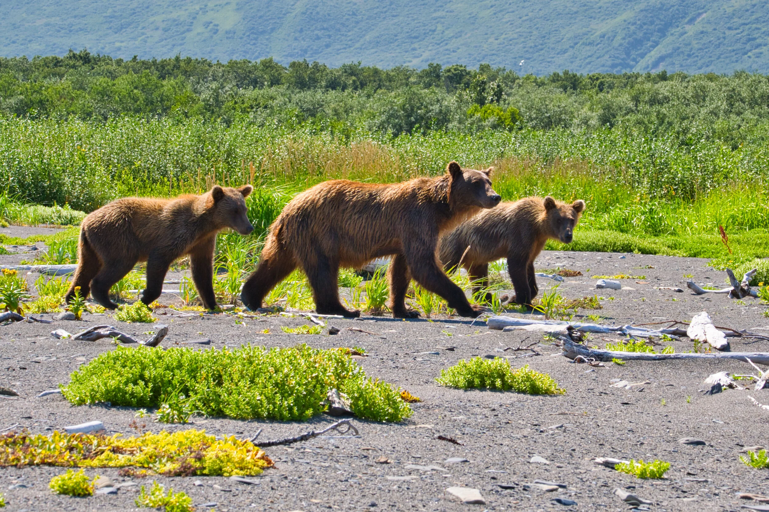 This mom is shepherding her pair of two-year olds on a salmon hunt. Lots of fun to watch. They were interrupted by a wolf and after chasing him away are returning to the stream from the ocean side of the dunes. Katmai National Park, Alaska. We are about 25 yards away.