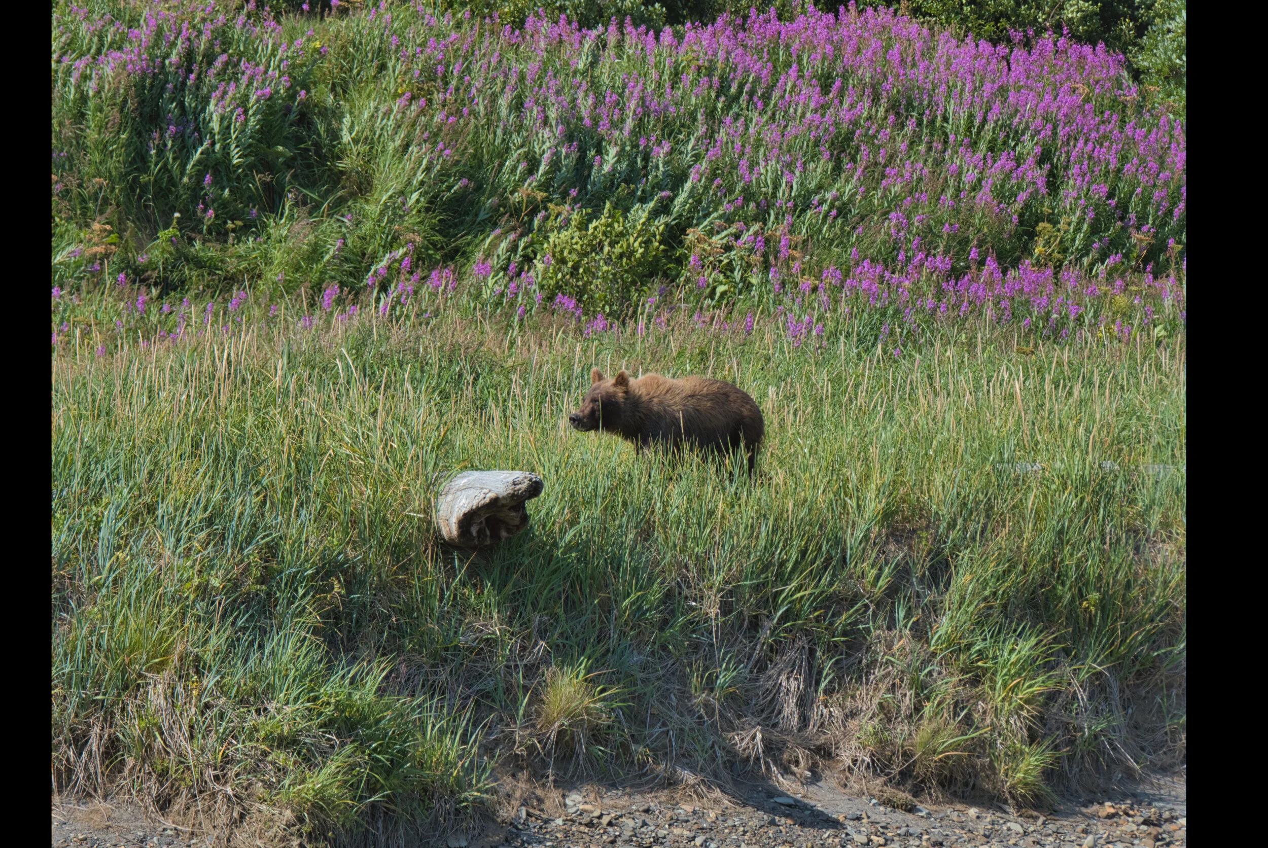 This young grizzly spent time in the in the high grass while his/her companion, likely a sibling, tried to catch a salmon in the stream below. I was amazed how an 800 bear would appear and disappear just walking along in the grasses.