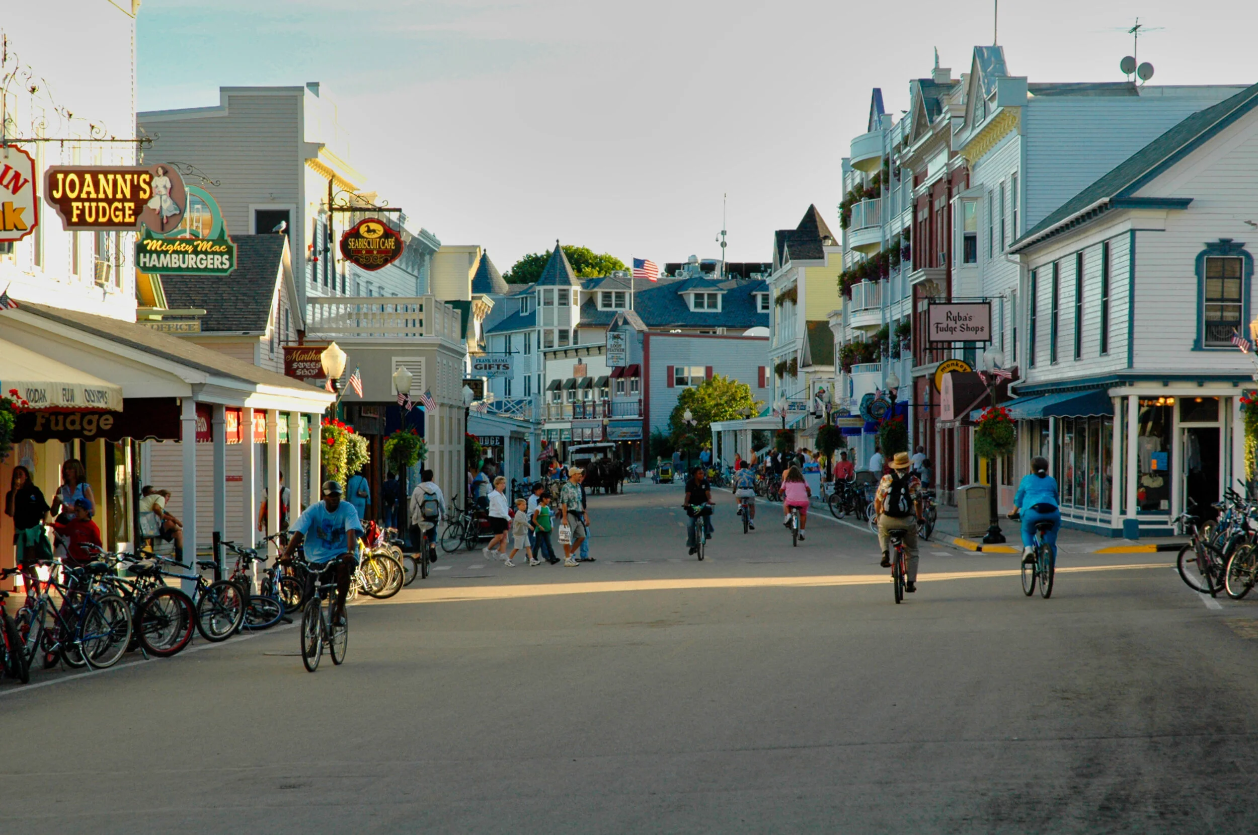 This rather poorly lit scene features three other things Mackinac Island is well known for besides horses: Fudge (three shops at least in this photo), bikes and late 19th and early 20th century architecture. But mostly fudge.