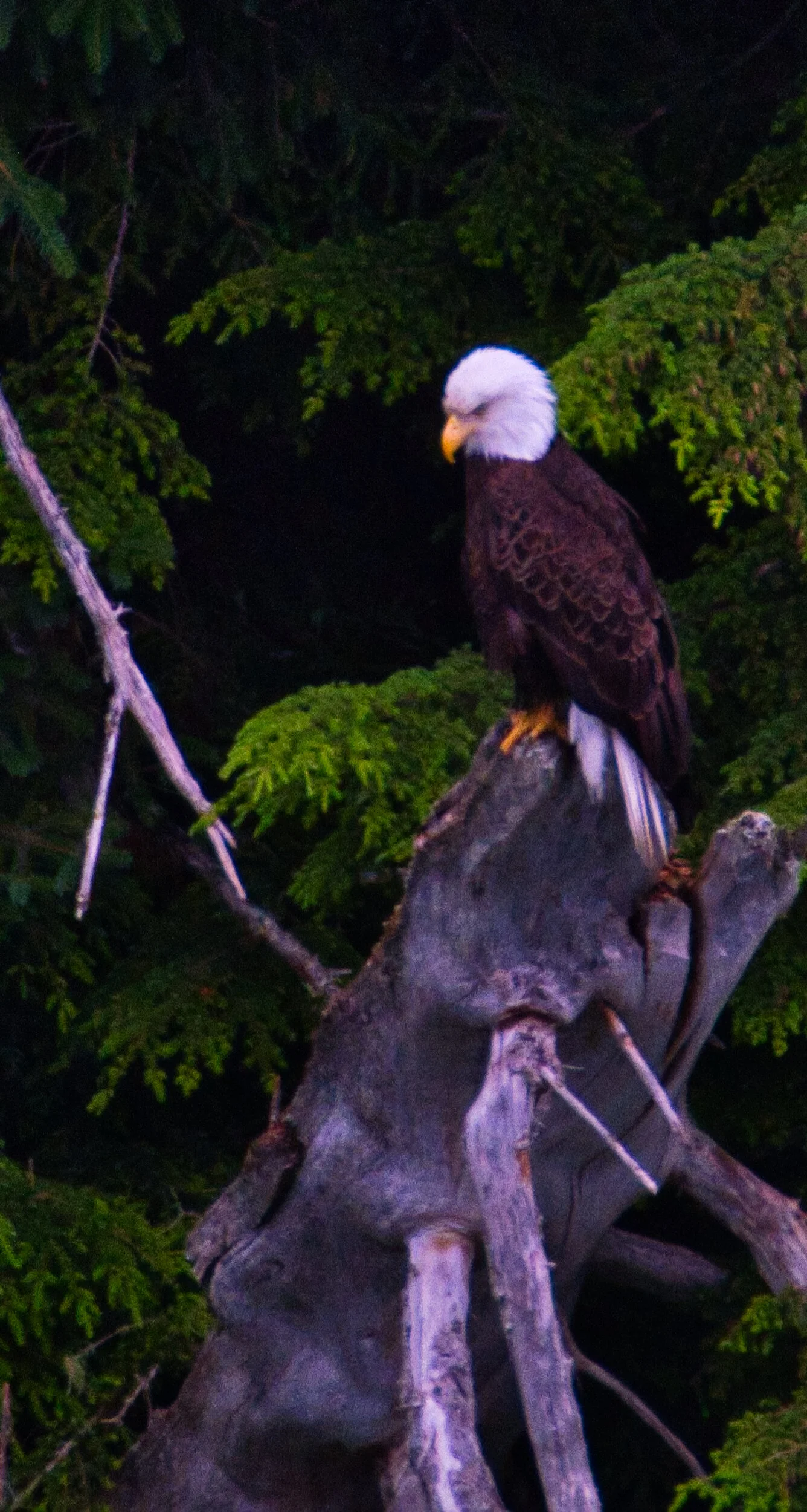 Hiking along a ridge in Sitka we came across this eagle that was on a dark tree deep in the shadows. We may not have seen it if it were not for a bit of brighter light on the white head feathers. It was lower than we were which was unusual. I was not sure I even captured an image here as it was really dark but with a bit of work in L4 I got this and I think it is pretty decent. The eagle deserved a better shot - quite a magnificent bird.