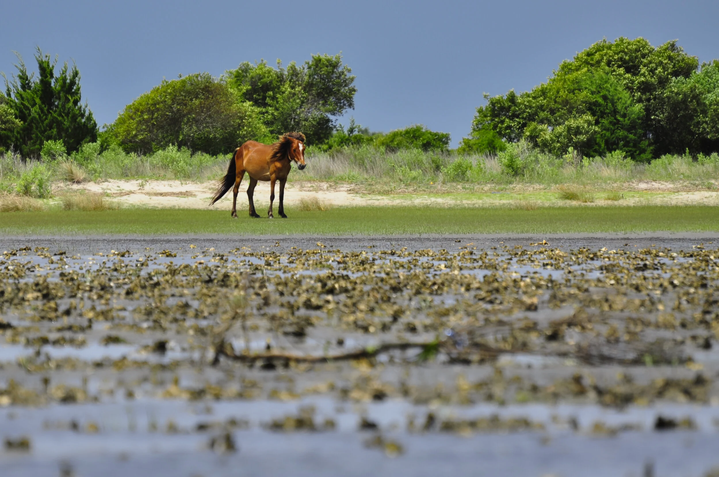 This wild pony is along the bay side of Cape Lookout National Seashore on the southern end of the Outer Banks. A lovely place with open spaces and lots of shells.