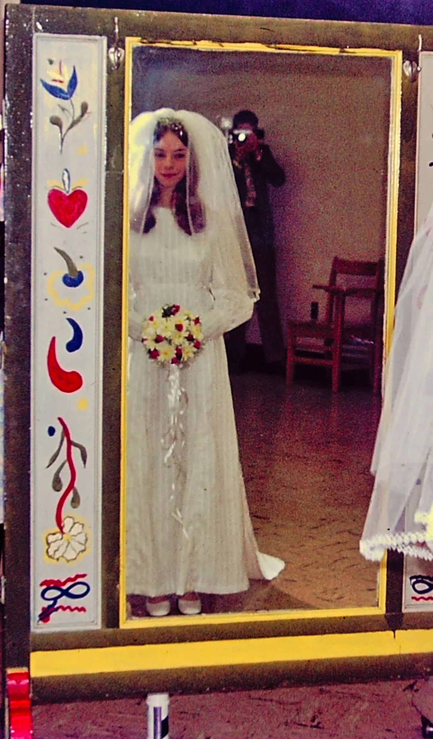 … for more than half a century there has been only one answer for me. Today we celebrate our 49th Anniversary. The wedding took place at Hood College in Frederick, Maryland on May 8th, 1971, the week before Cindy graduated from the college. She is framed in a mirror that I guess was in the chapel somewhere. The flowers she has were picked by our minister’s wife along the side of the road as they traveled from Pittsburgh to Frederick. Cindy made her wedding dress and her Aunt Timmie made yards of tatting that was incorporated into the dress.