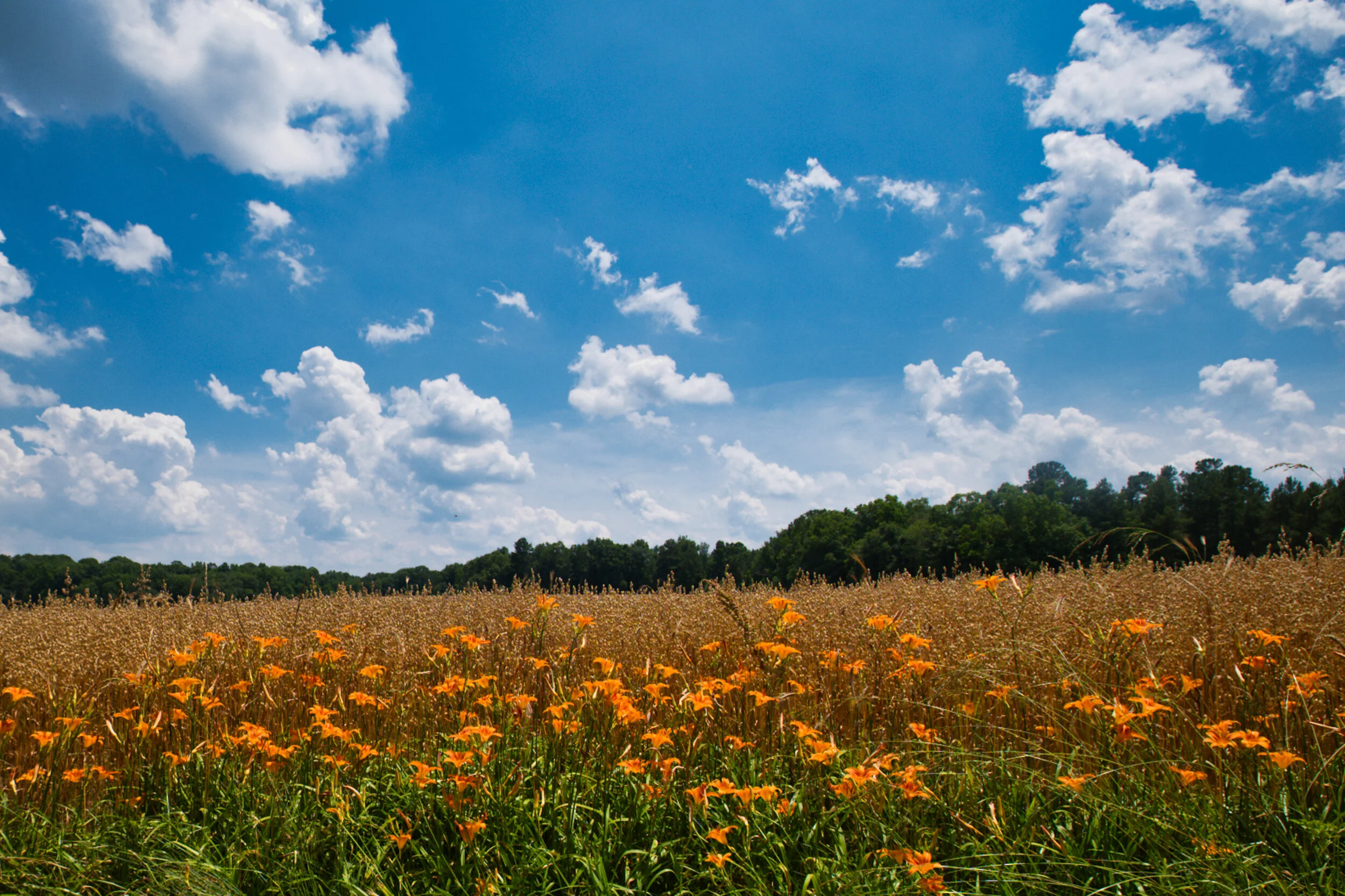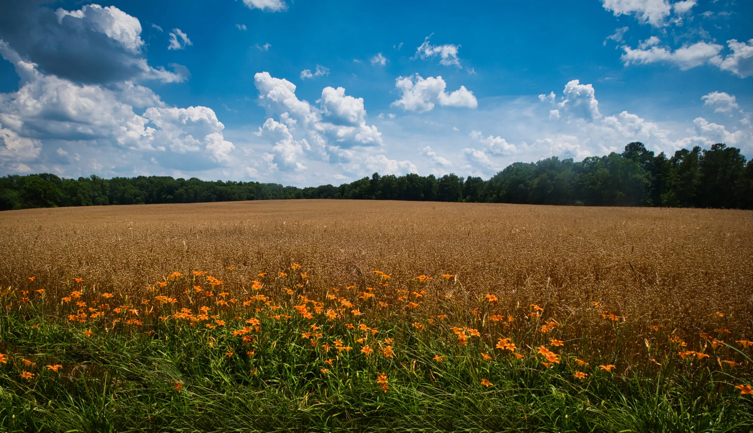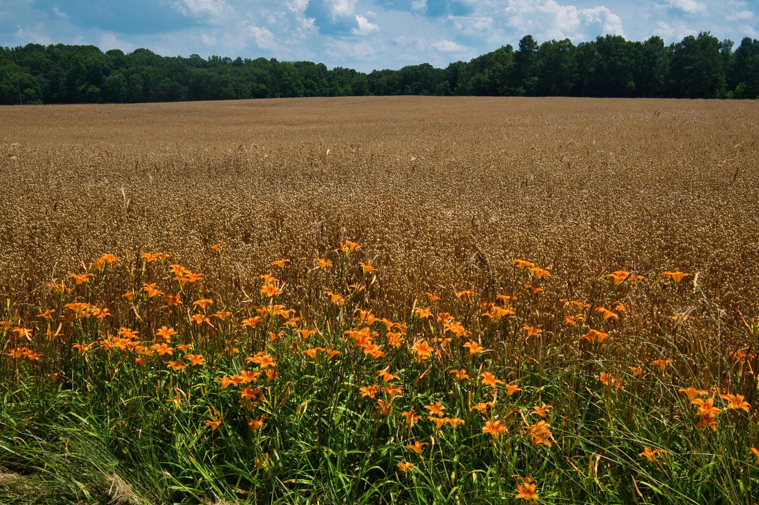 On our Sunday ride we were about an hour from Raleigh on our way back home but on a small two-lane road in a very rural part of NC south of I-40/85 in an area known for pottery - we passed a few shops but none were open. I saw this field with the wild flowers blooming and thought photo opportunity. So I turned around and found a driveway about 100 yards away and no one seemed to be home, so I parked and walked to the field. Now the road was narrow and had a steep ditch on both sides and not too far from the curve so the occasional traffic was an issue. I could not use my tripod and could not stand on the road so just a narrow strip of steep culvert to shoot from - moving each time a car or a big truck passed. I shot three perspectives one emphasis on the crop field, one on the sky and one more balanced. Love to know which one you think is the more complete image. Of course, all of them would be better with a nice green John Deere about 2/3 across the field, but you get what you get.