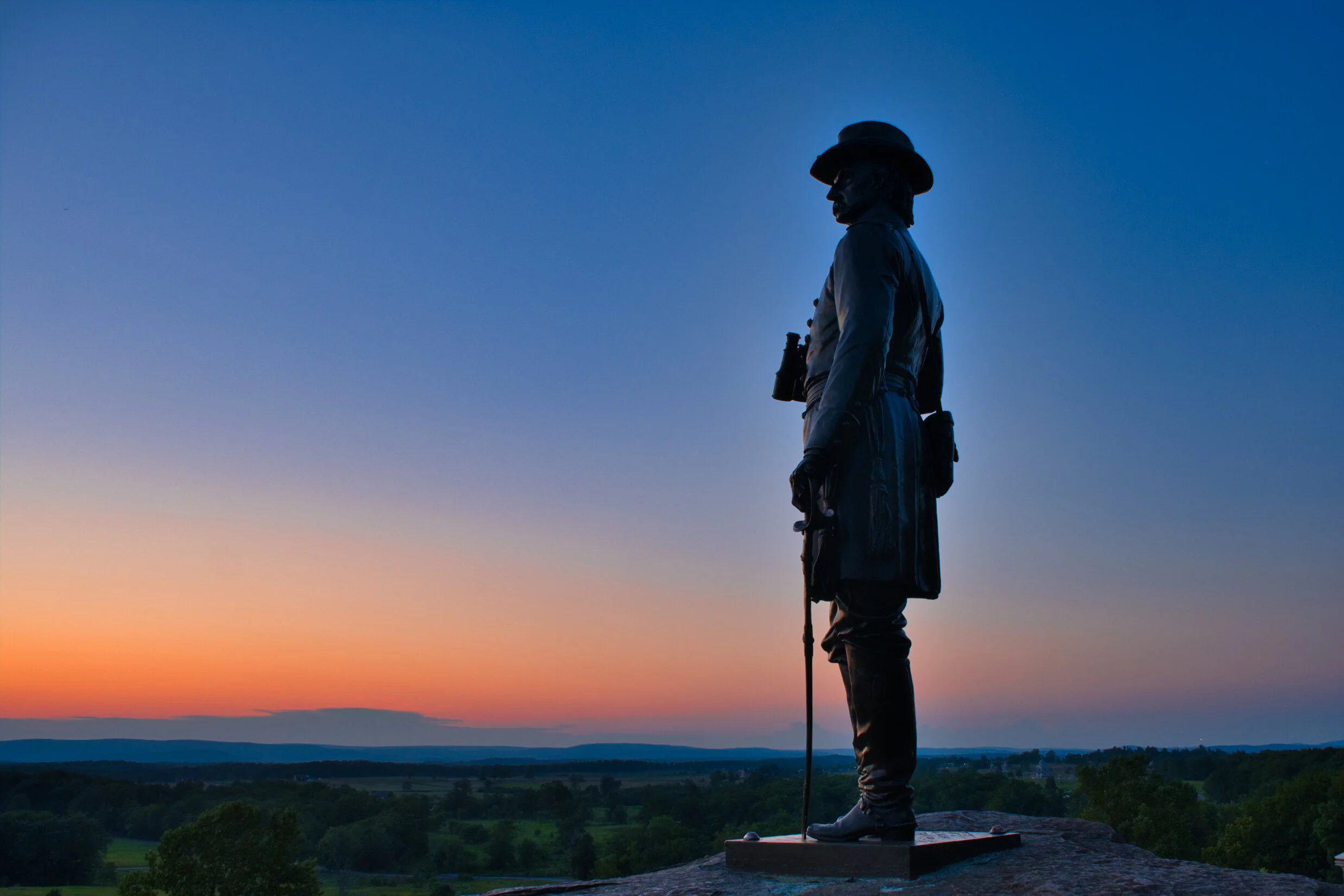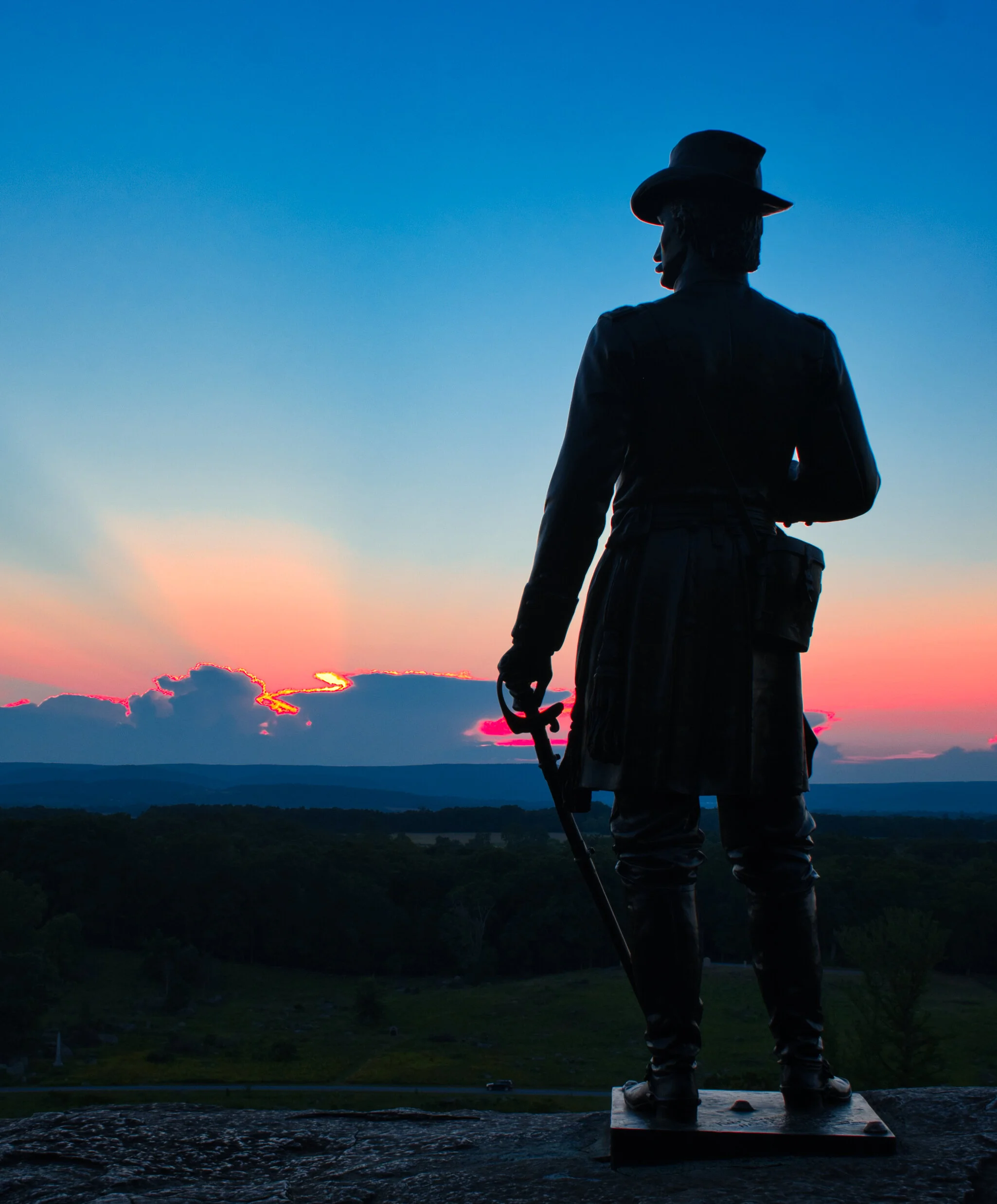 Over the years I have visited Gettysburg countless times but I never took a photo of Warren like the cover of “my” book. Until last night. I was there the sun was setting and I tried to recreate the cover I remembered. I could not get the sun to move from behind the cloud but that was OK. I did, it turned out, shoot the photo too high, but I got the angle pretty well from memory. It was not the photo I liked the best that night, that would be the last one of this post. Lots of fun in the heat!