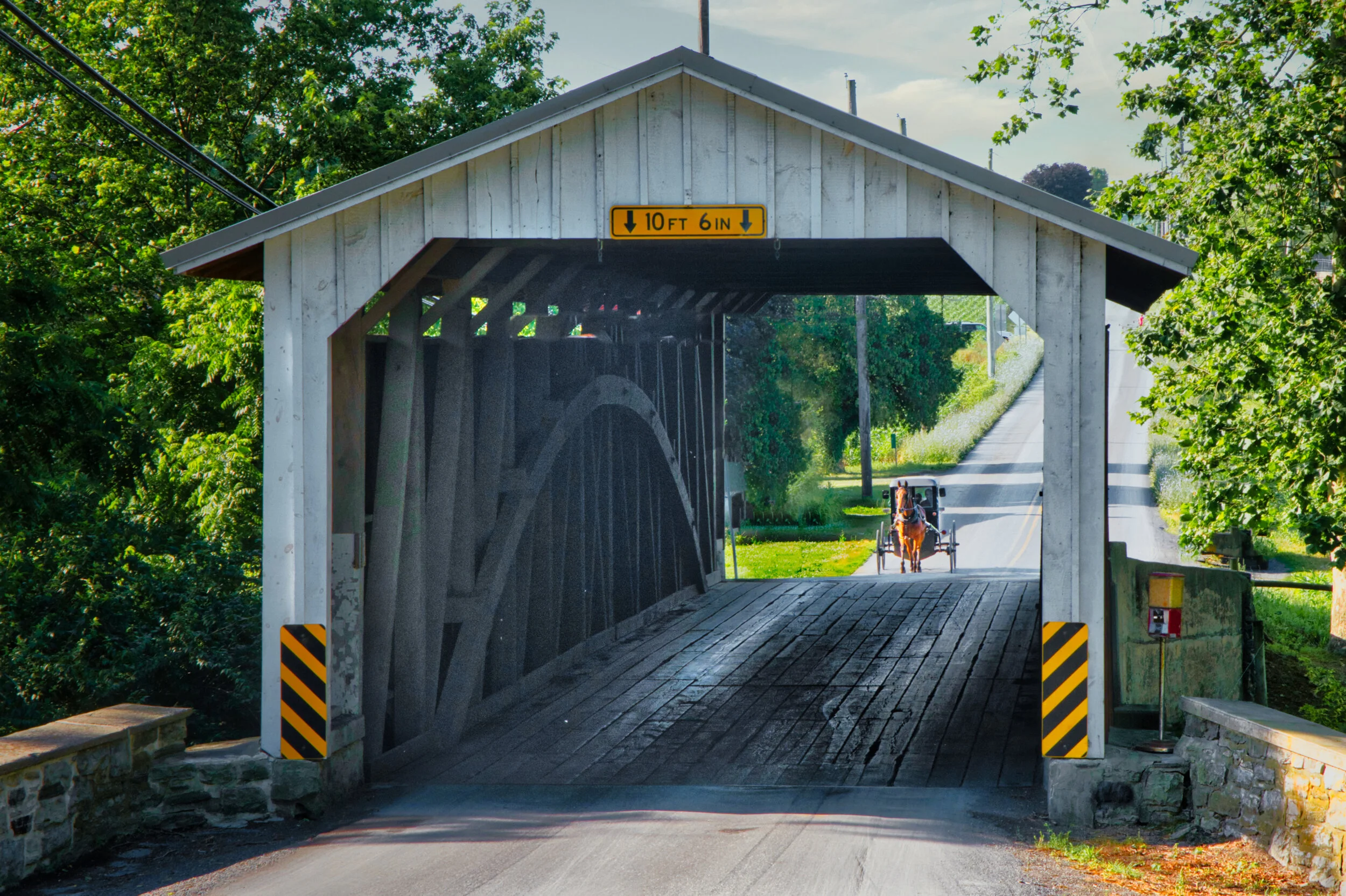 There are more than twenty covered bridges in Lancaster County. Most of them are still being used to cross small streams. A few are closed to traffic or now in parks or tourist haunts. This one is in everyday use and is pretty busy. The wagon is approaching from the south. Please note the in the right hand side of the photo on this side of the bridge - set up by some entrepreneur, a small vending device for you to get corn to feed the ducks. Cool.