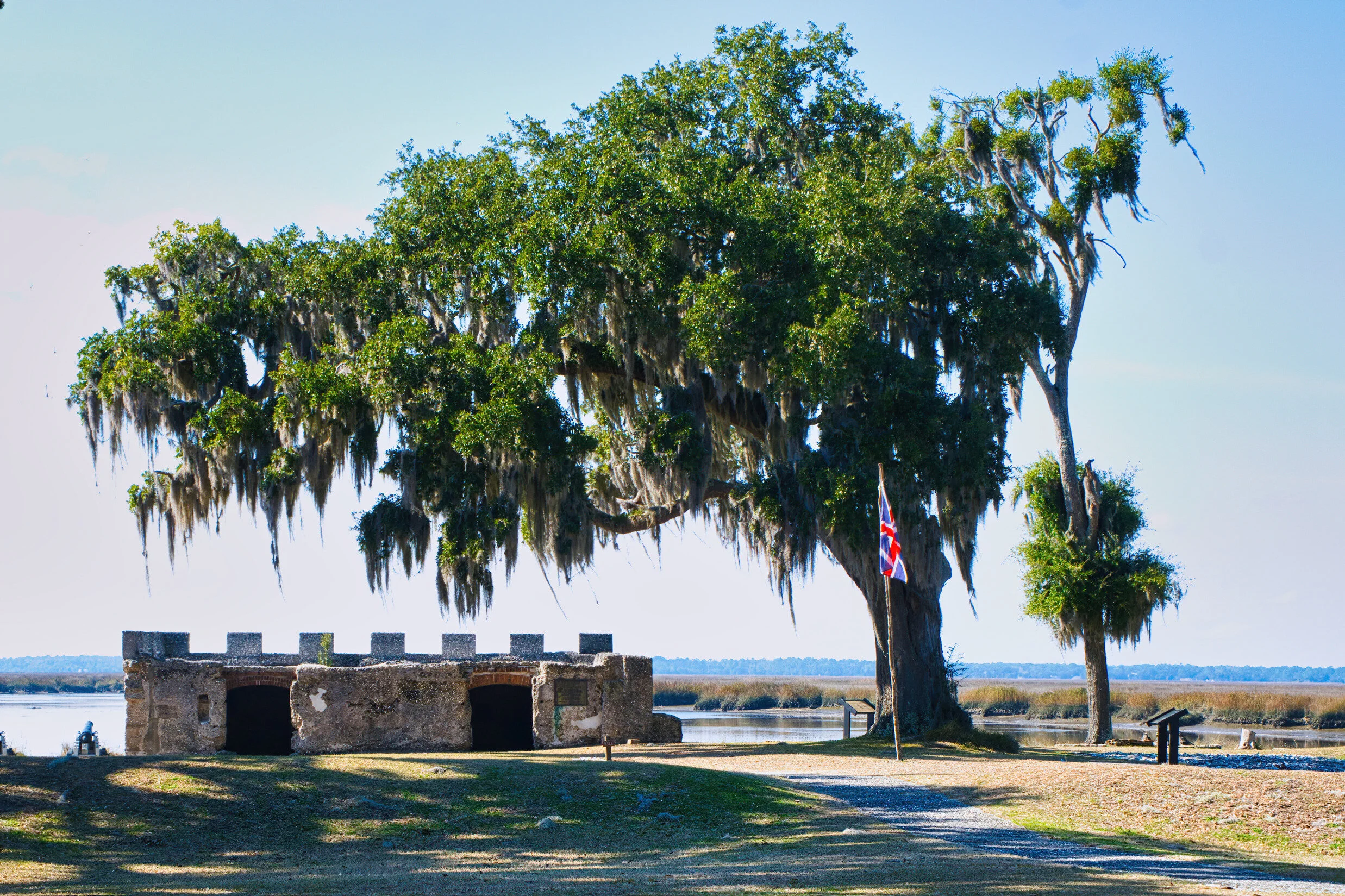 Oglethrope established this fort and town south of Savannah about 50 miles to protect the main colony from the Spanish. At its peak it had a garrison of 200 soldiers and more than 500 residents. All that is left are foundations and this crenelated magazine. The cannon for the fort were in bastions to both sides of this structure facing the water. The outpost worked as planned. Tthe Spanish attacked in 1742 and were defeated a mile or two south of the main fort in a surprise ambush. They never returned.