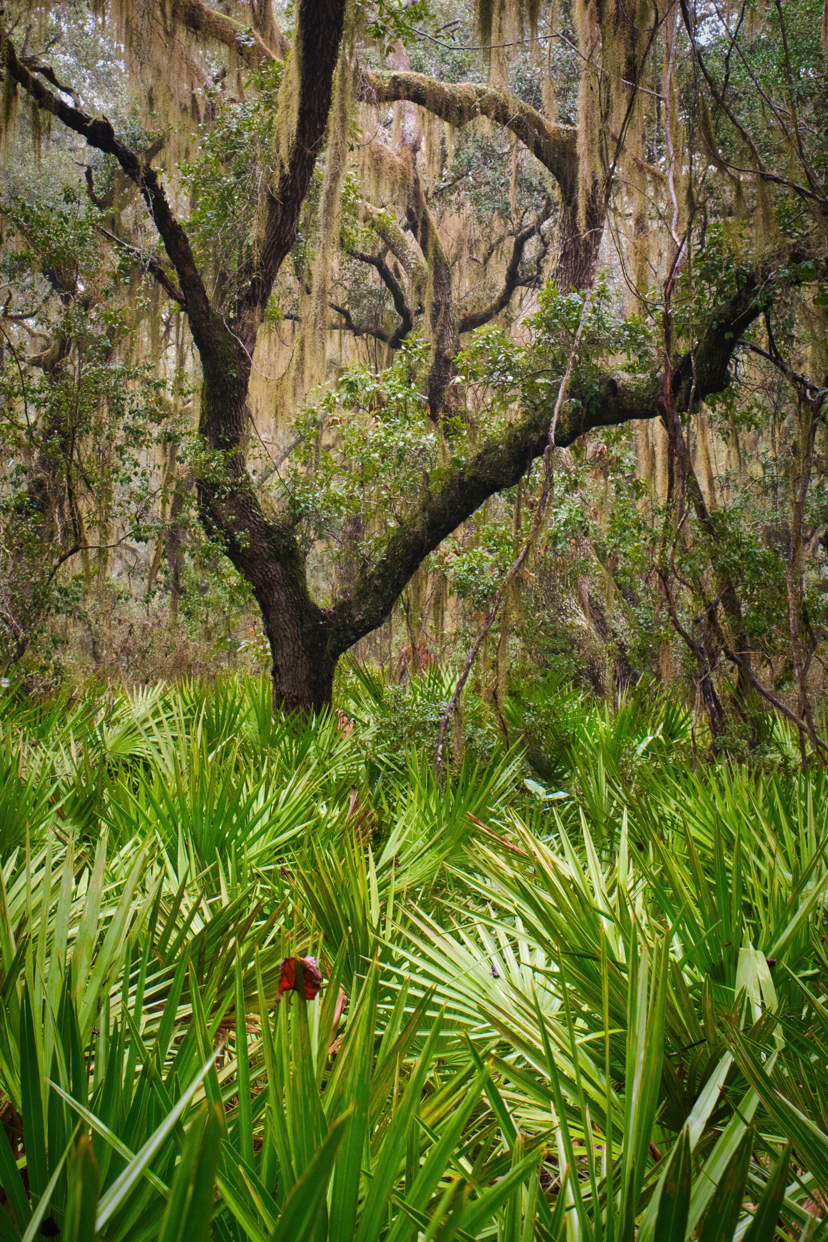 It is hard in the midst of a forest to see the individual tress but and on Cumberland Island they are breathtaking. High canopy, twisty dark branches all draped with moss and dripping with rain- of course it was raining. Still what a glorious place. I liked this tree that framed a tree. The palms are between 4 and 6 feet tall so I had to wade in about 30 feet to get a clear shot.