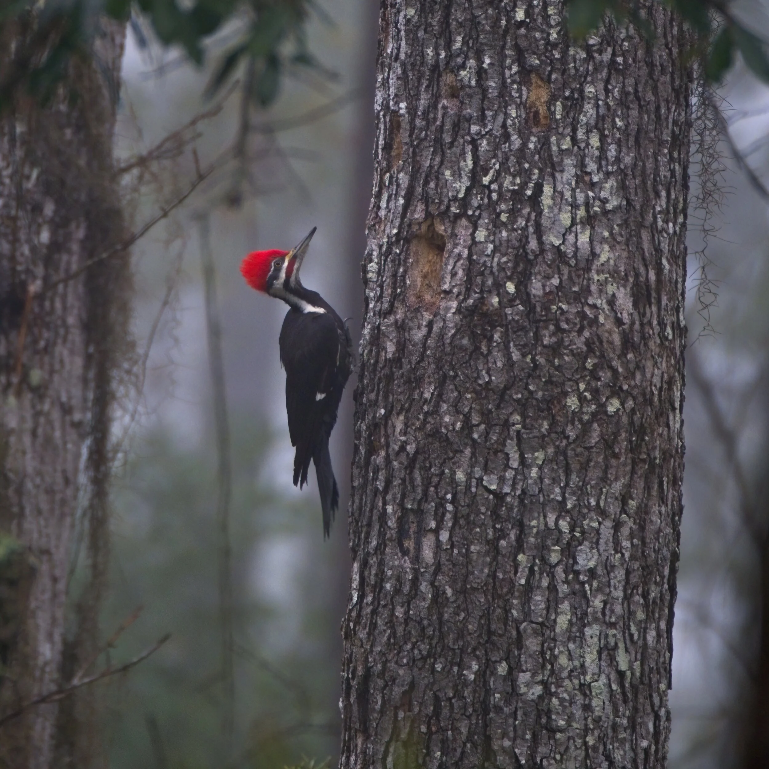 Well into a coastal forest we came upon this Pileated Woodpecker. If you notice the patch of bark missing near his beak, it is where he was chiseling away with the distinctive squared holes that mark their feeding areas. This is a rather new one as it only has the outer layer removed so far. These are big, crow sized, beautiful birds that sound a bit like the background birds in the old Tarzan TV series- which I expect has something to do with where it was filmed! This one was striking in the dark, moist forest.
